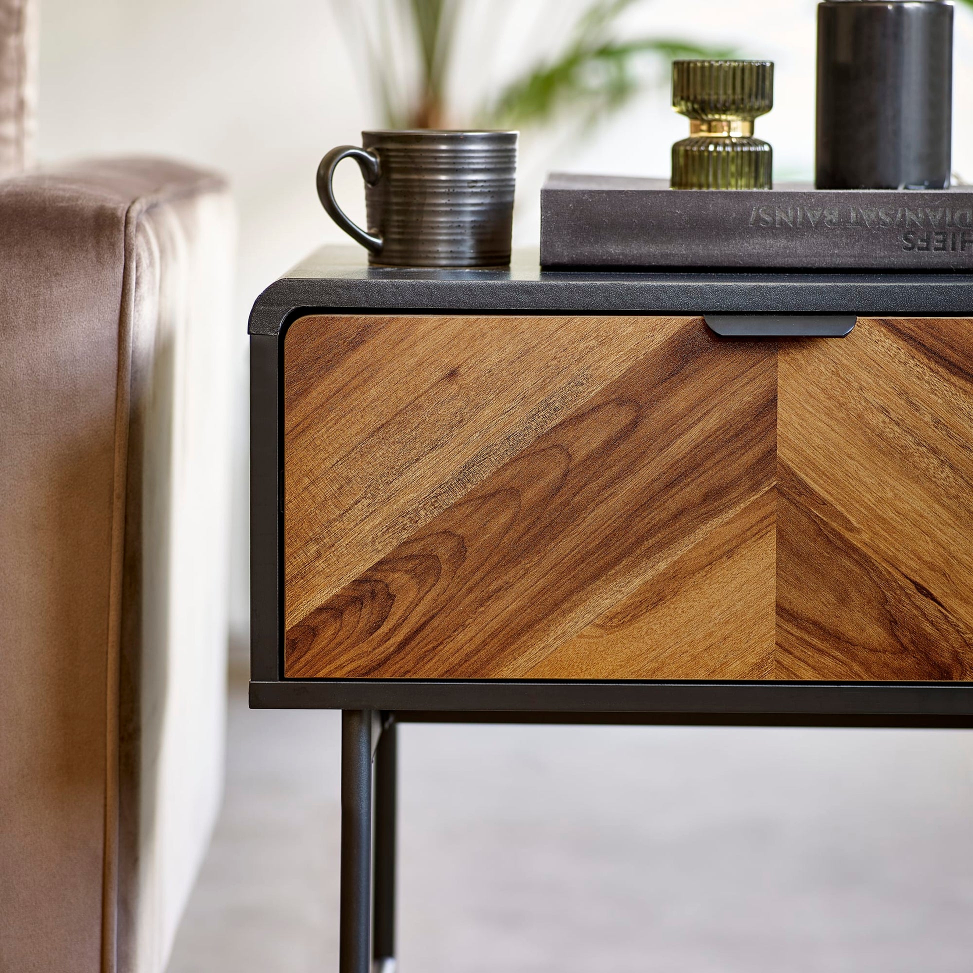 Bring a modern industrial edge to your living space with this stylish side table, where natural tones meet contemporary design. The bold chevron wood-effect drawer front adds texture and character, while the slim black metal legs create a sleek, open feel. Compact and practical, it works beautifully as a sofa side table or bedside table, with a handy drawer to keep everyday items neatly stored. A versatile addition to living rooms, bedrooms, or hallways. Self-assembly required.