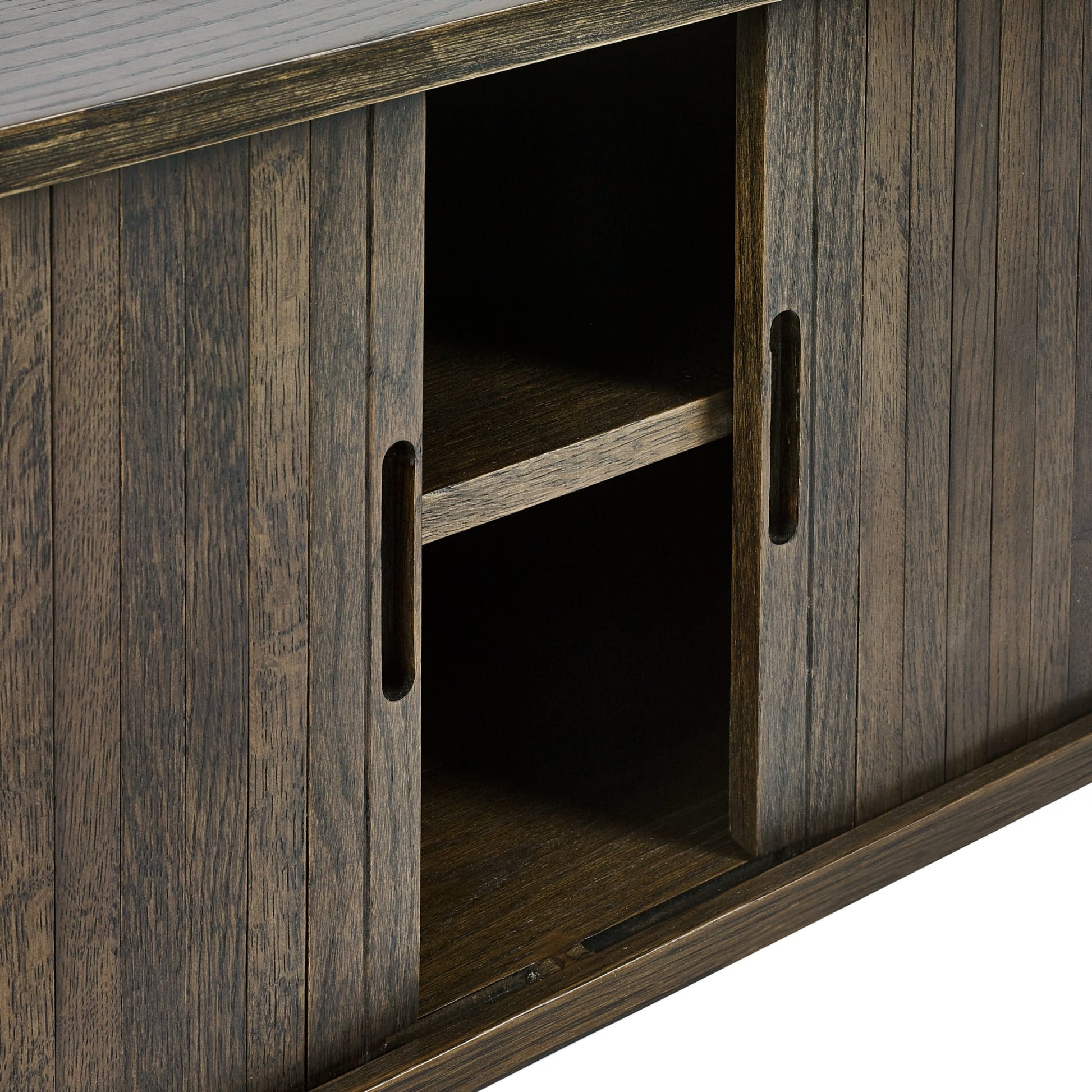 Make a statement in your living space with the Arya Tv Unit, combining both style and functionality. Crafted in a rich dark finish with striking slatted sliding tambour doors. Inside, you'll find ample storage with shelves and additional smaller side shelves—ideal for organizing CDs, DVDs, game boxes, and displaying decorative pieces. The two cut-out handles and four sleek tapered legs add a modern touch, elevating the look of any room. Whether you're tidying up or showcasing your favorite items, this versatile piece offers the perfect blend of design and practicality. Full assembly required to have it functional and ready.