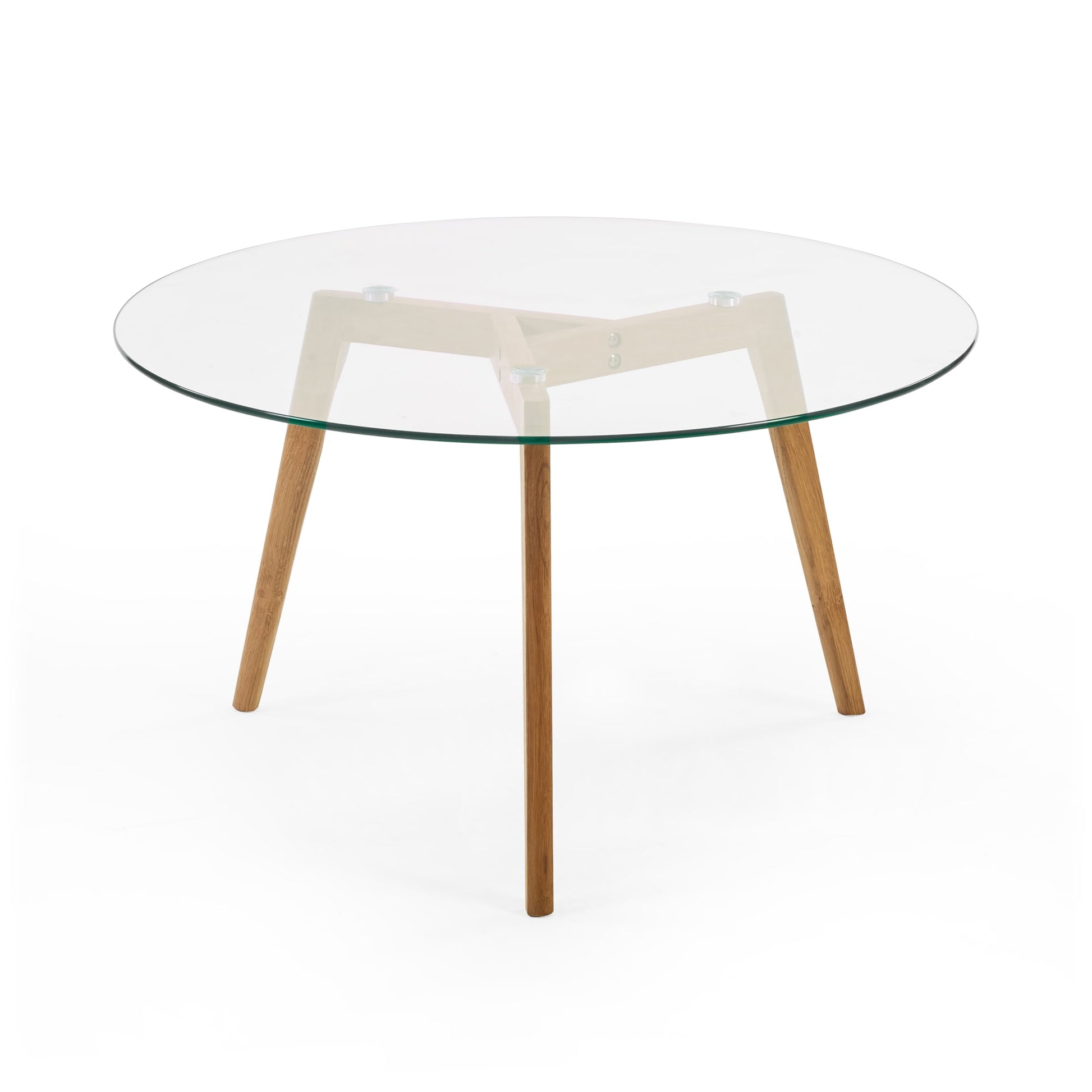 Bring a fresh, contemporary touch to your living space with this beautifully balanced coffee table. The round tempered glass top creates an airy and open feel to your space, while the oak tripod leg base provides natural warmth and character. Subtle bolt detailing beneath the glass adds an industrial modern edge. Fitting perfectly into both modern and classic interiors. Full assembly required.