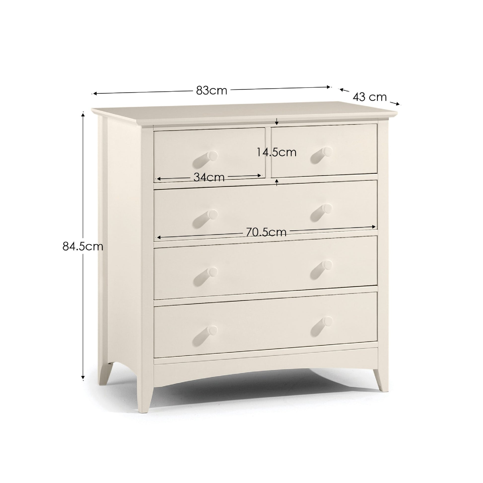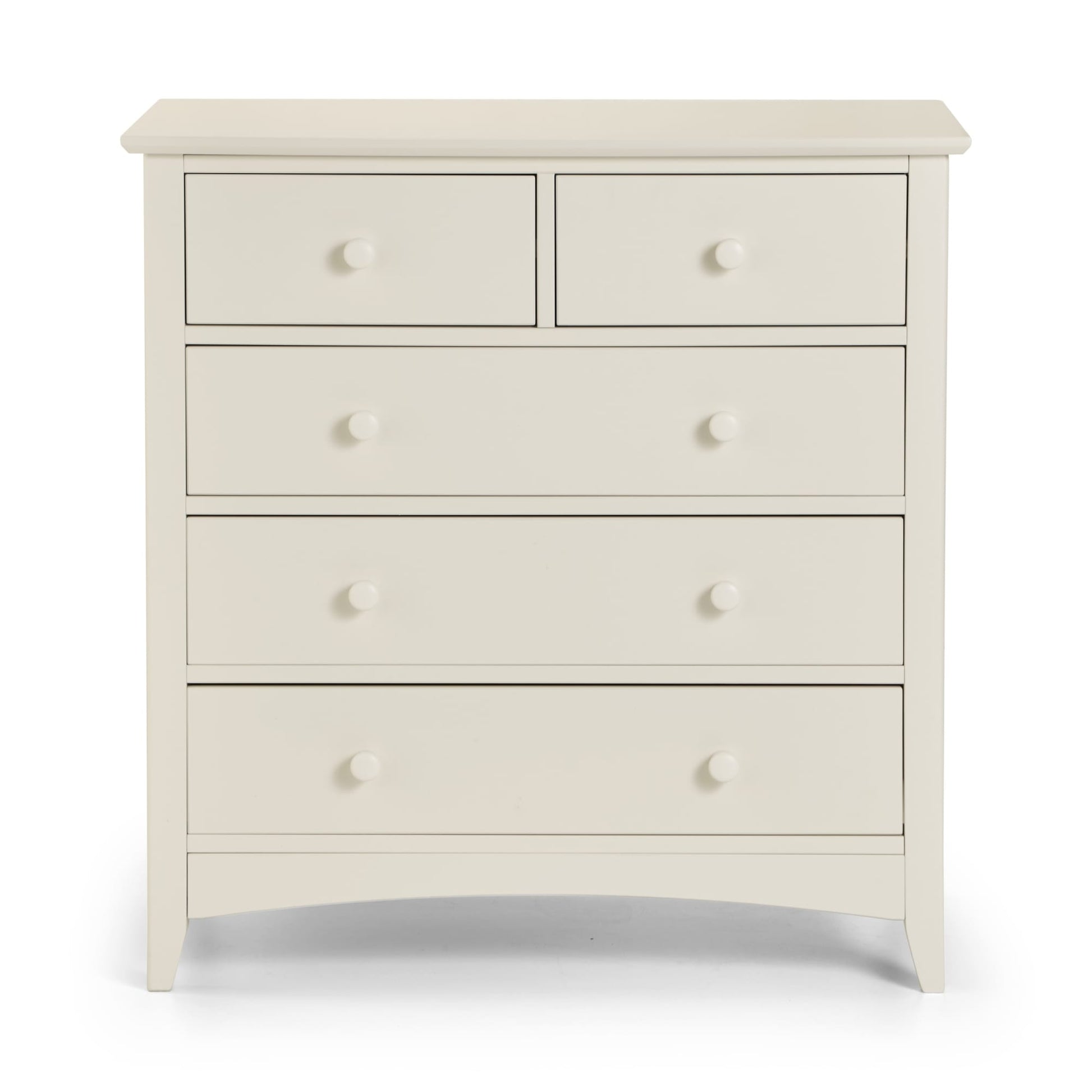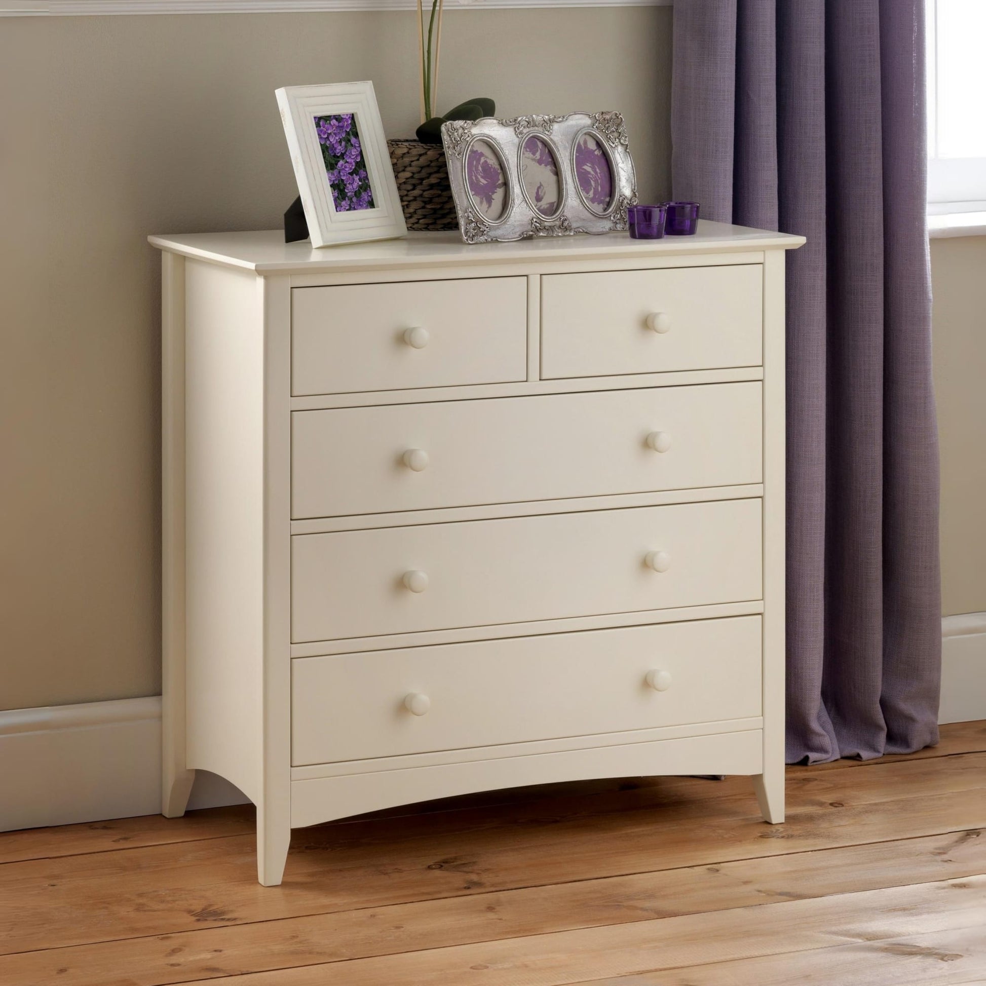 Cameo is a beautiful stone white lacquered bedroom range. Its timeless shaker design is the perfect accompaniment to any interior style and is perfect for grown-up bedrooms and children's bedrooms alike. Solid pine frames ensure a sturdy and durable construction. The Cameo 3+2 chest offers a great storage solution with 2 small drawers and 3 large drawers.
