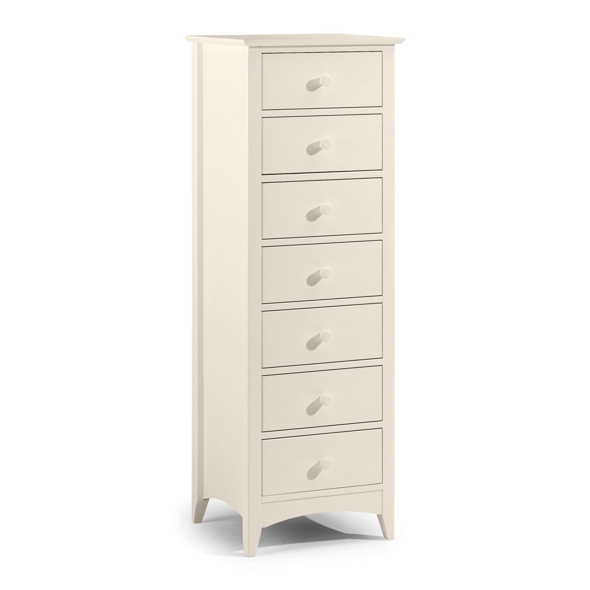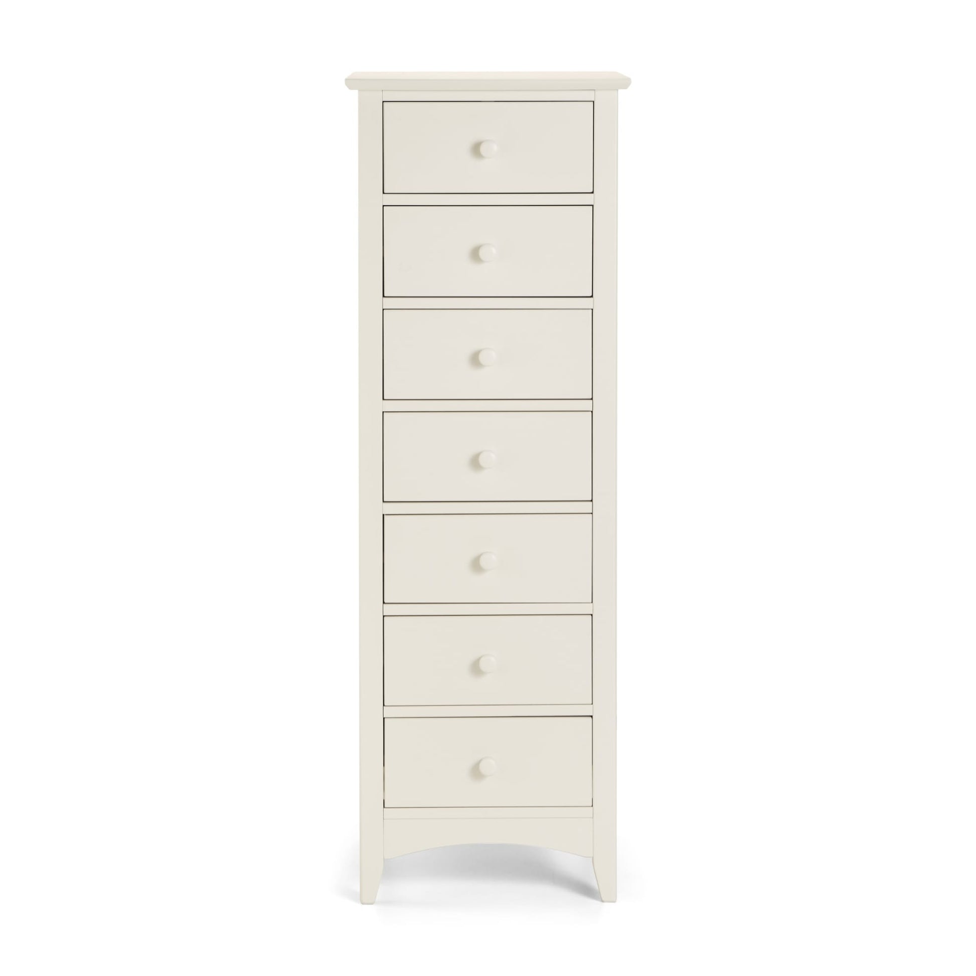 Cameo is a beautiful stone white lacquered bedroom range. Its timeless shaker design is the perfect accompaniment to any interior style and is perfect for grown-up bedrooms and children's bedrooms alike. Solid pine frames ensure a sturdy and durable construction. The Cameo 7 drawer narrow chest offers a great storage solution for smaller rooms given its compact footprint.