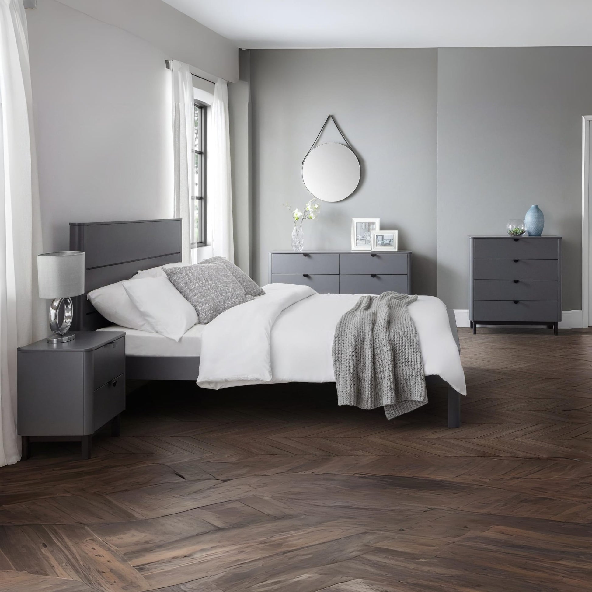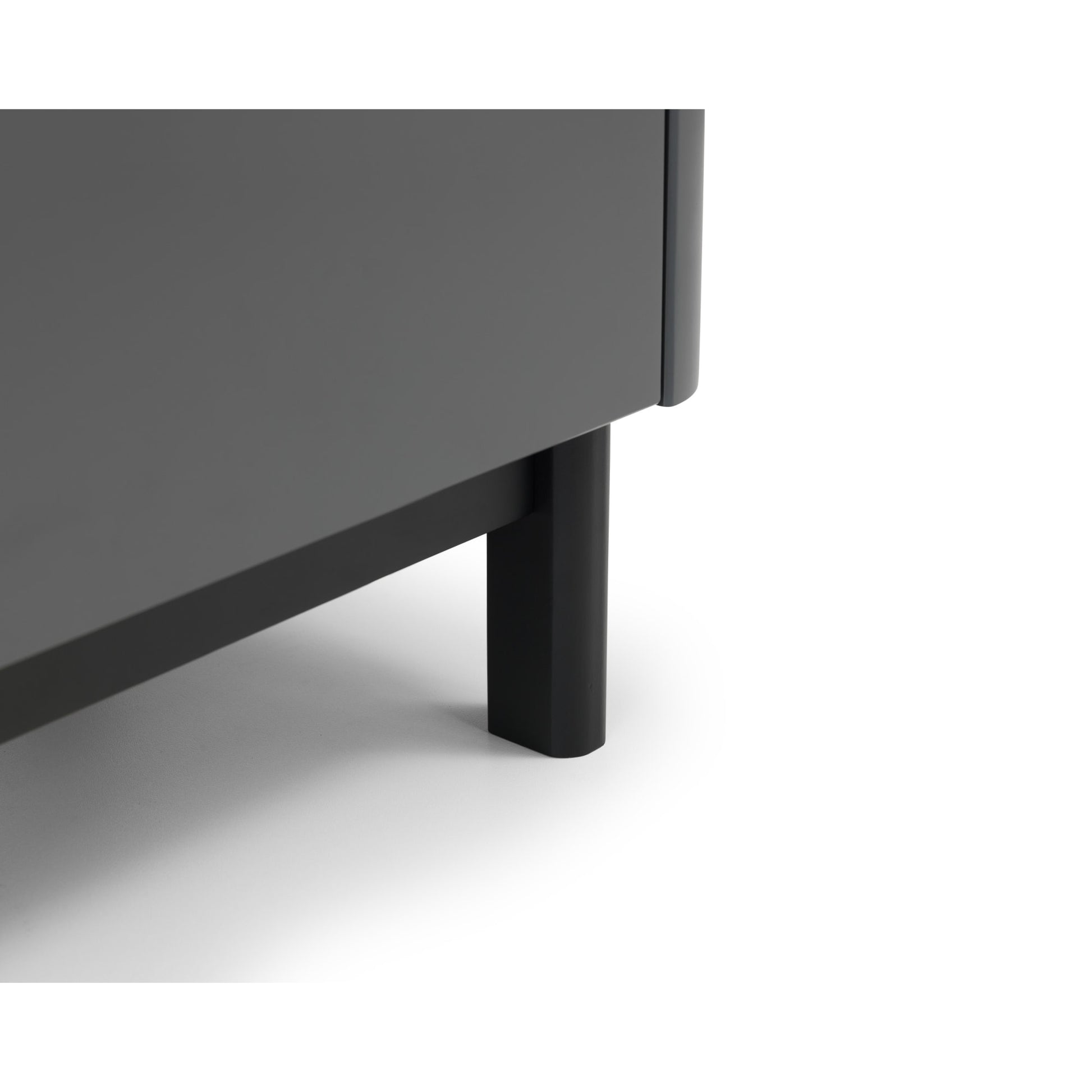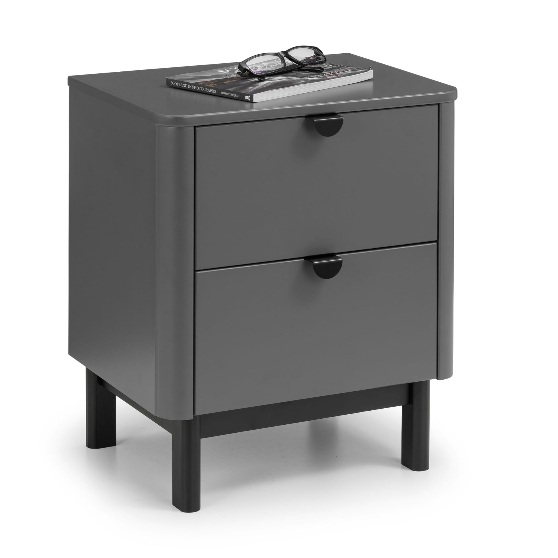 The Chloe Bedroom collection has a modern, retro style, available in a storm grey finish with satin black wooden legs and handles. The corners are rounded for a softer look, creating perfect balance between style and functionality. Stow away all your night time essentials with the Chloe 2 drawer bedside.