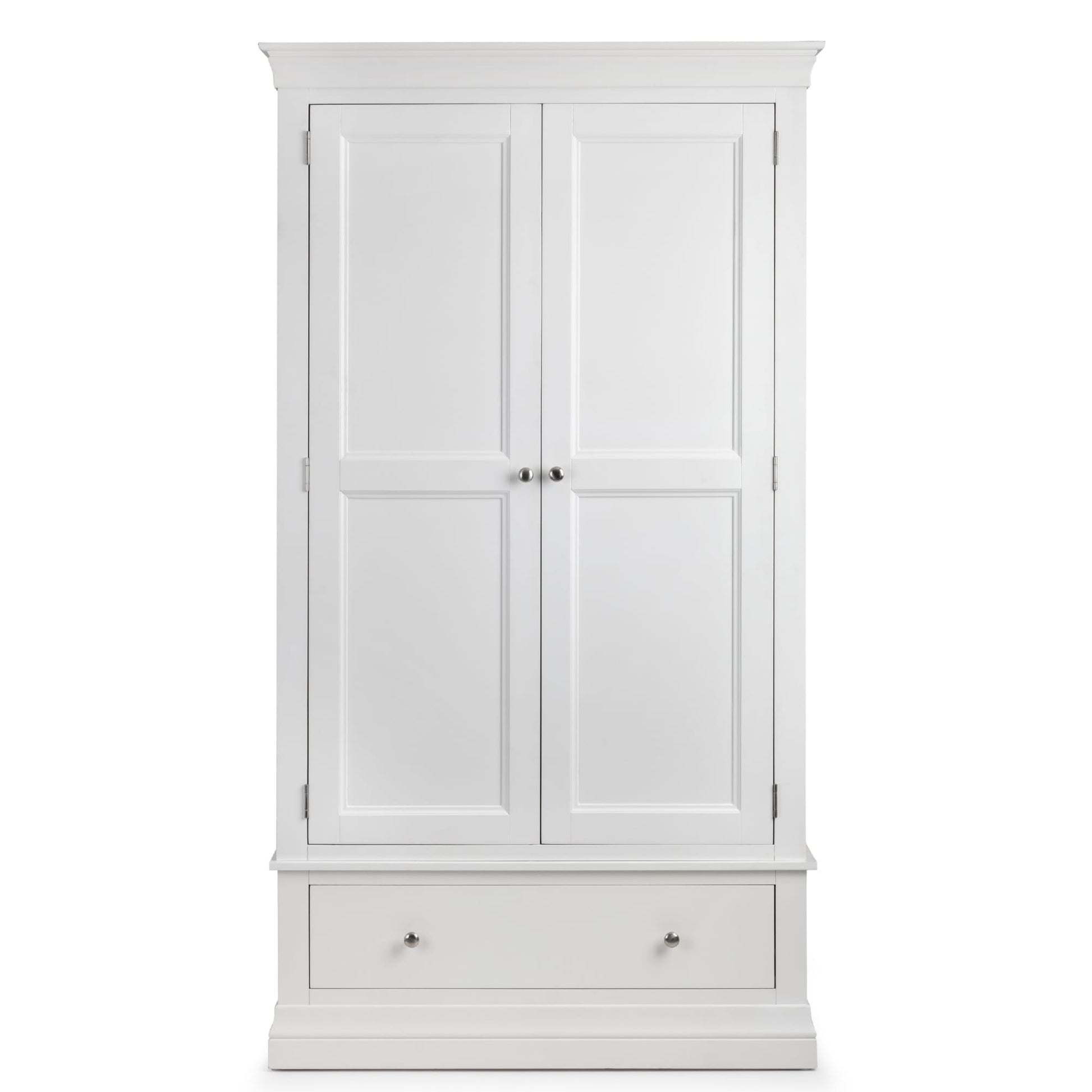 The Clermont Bedroom Collection is finished in a lacquered finish, with simple clear lines that add a feeling of light and space. Crafted from Pine and MDF, featuring brushed steel handles, this elegant French inspired design is suitable for both contemporary and traditional settings. The Clermont 2 Door 1 Drawer Wardrobe offers a generous hanging space, along with a full width drawer for bulkier knitwear.
