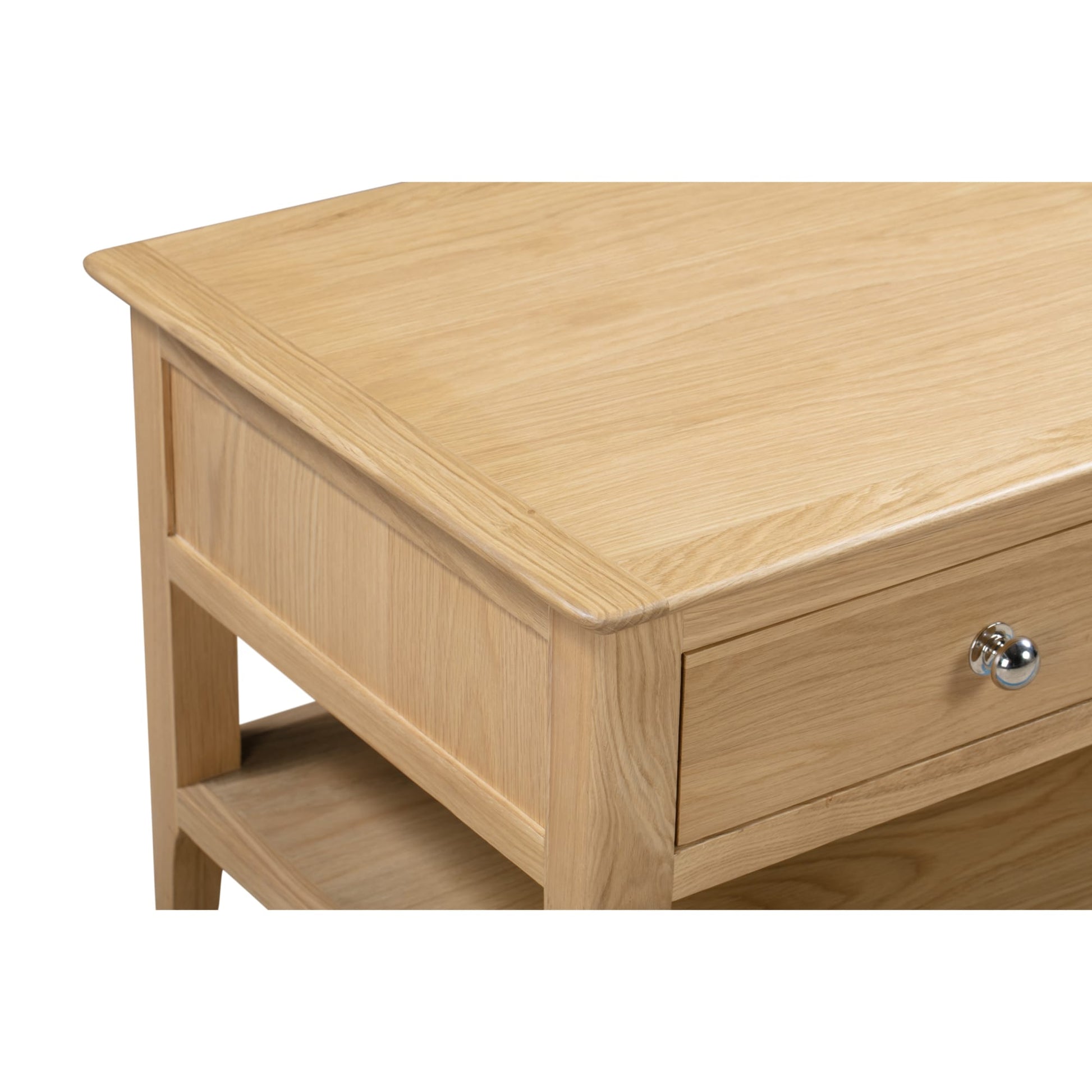 Crafted from oak and oak veneers, the Cotswold Coffee Table With 2 Drawers features 2 drawers and a spacious shelf for keeping your essentials organised. This simple, yet stylish design is an ideal additional to any traditional living room with its soft edges and charming round silver knobs. Part of the Julian Bowen Cotswold Dining & Occasional Collection.