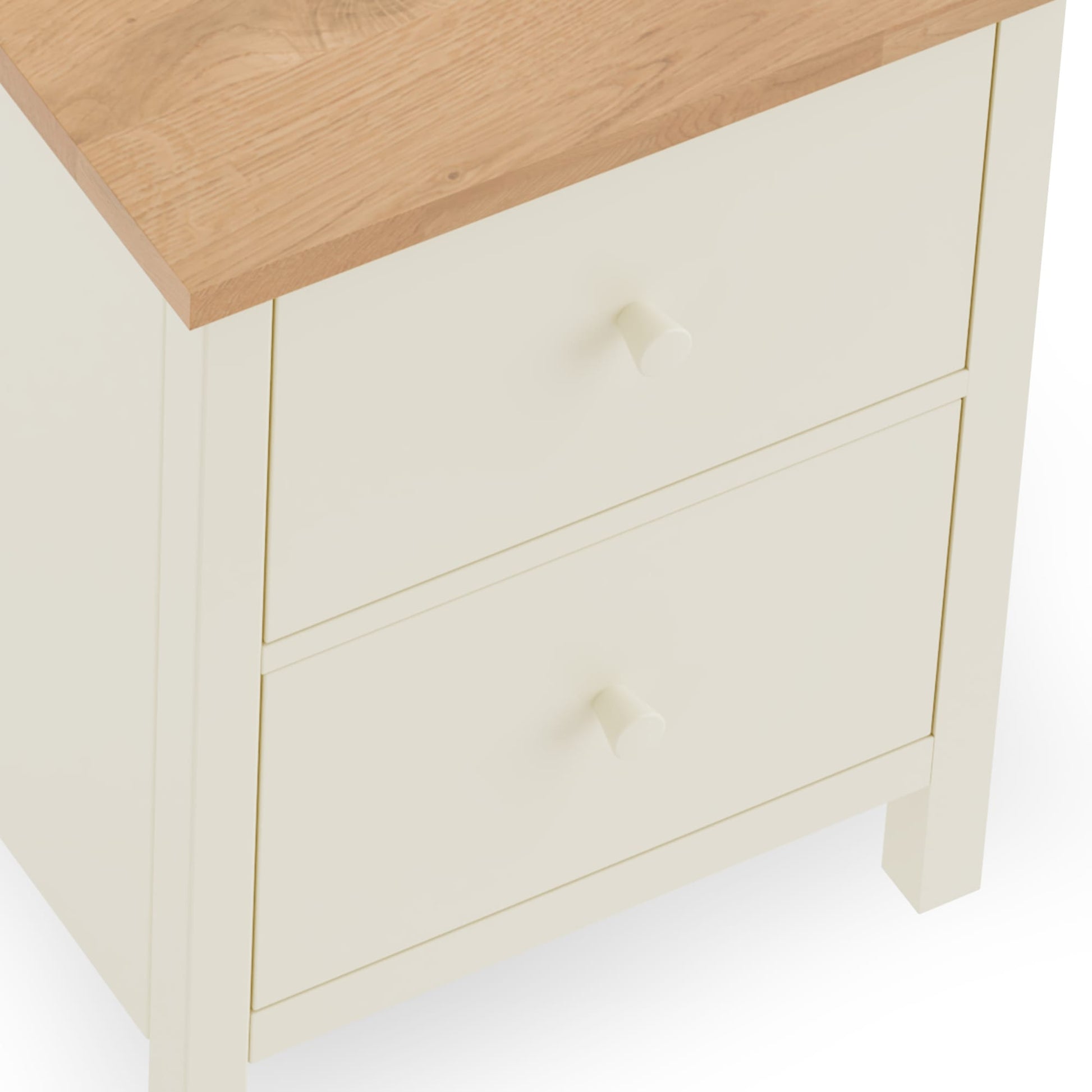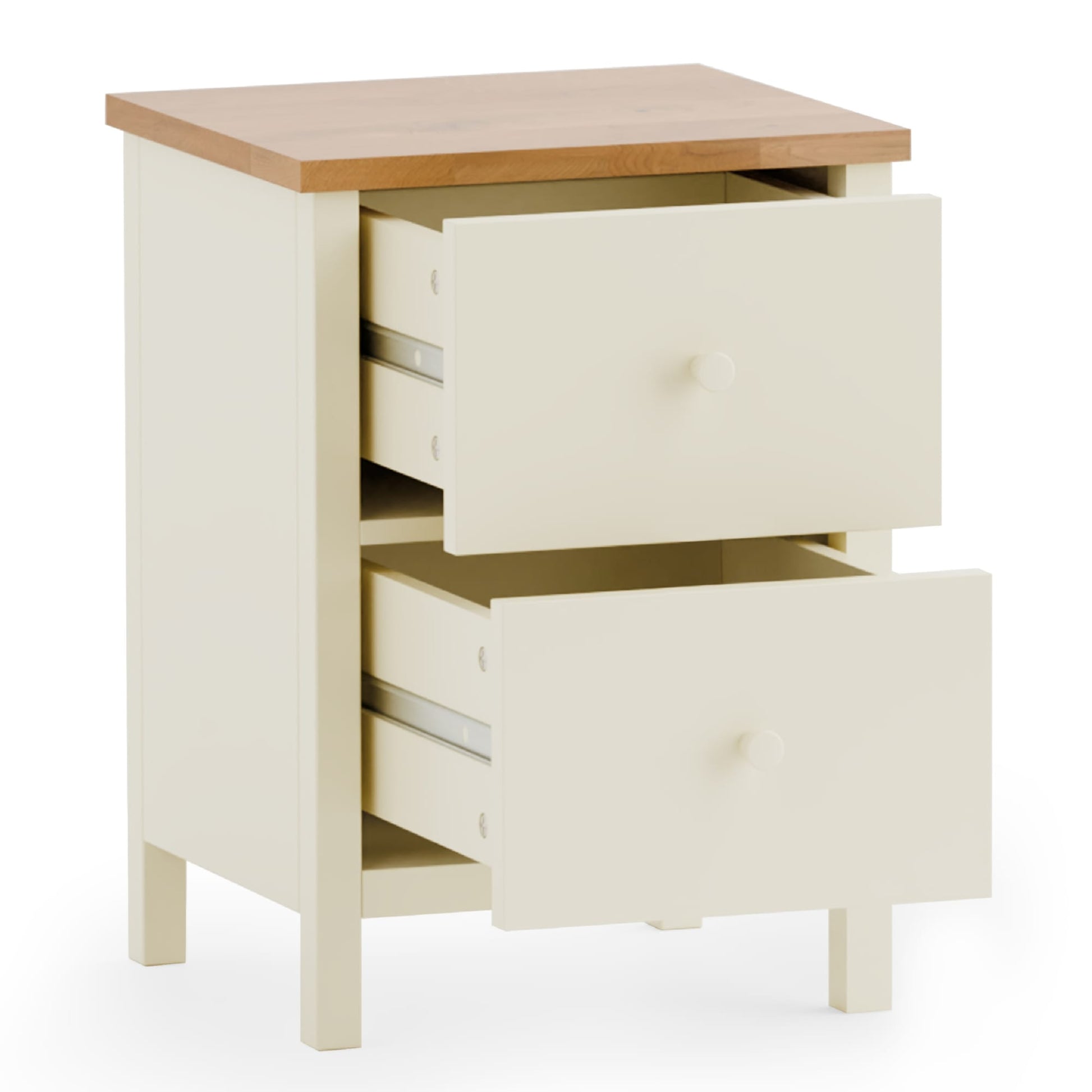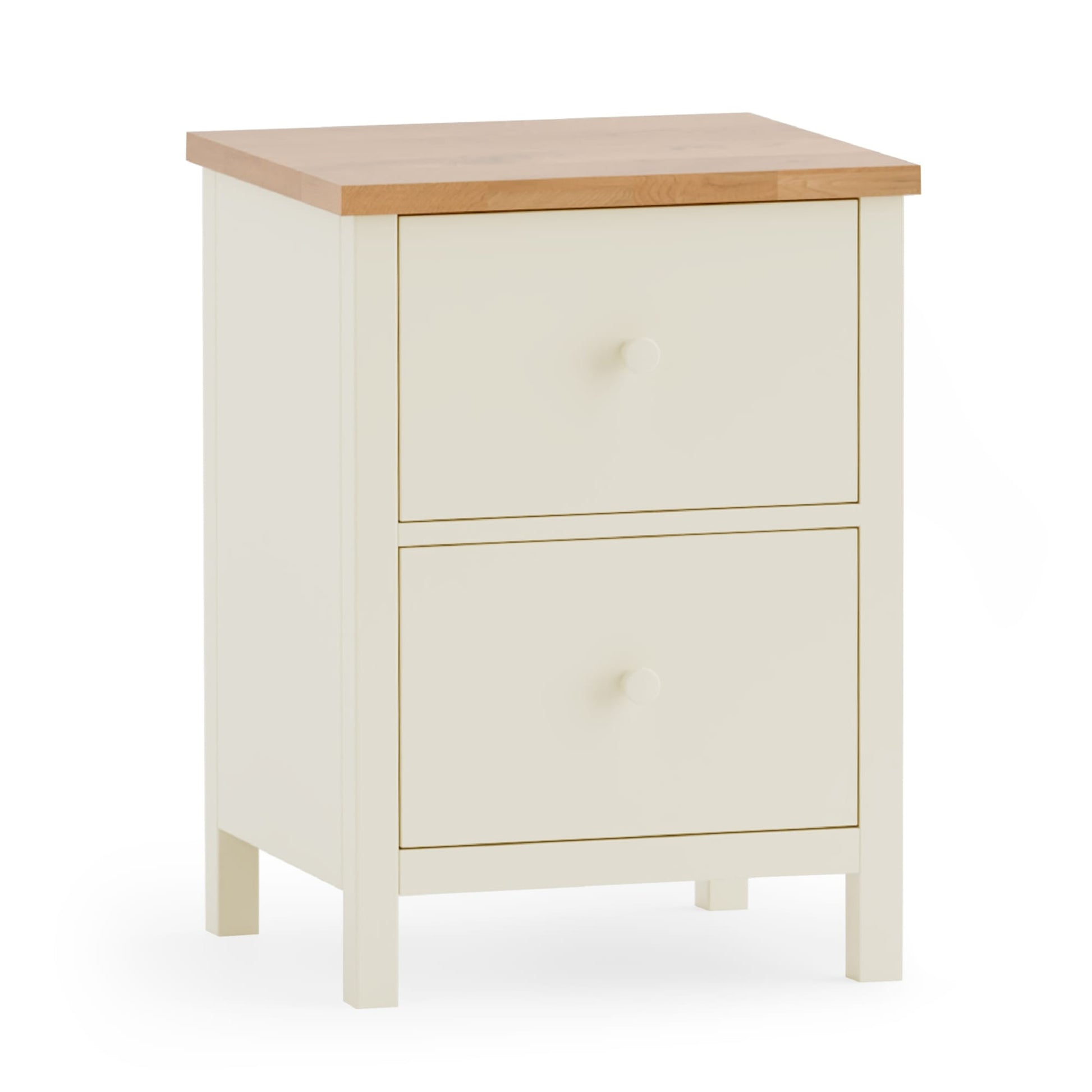 Add a touch of rustic charm to your home with the Coxmoor 2 Drawer Chest, available in an ivory and oak finish. Featuring two spacious drawers with knob handles, it provides ample storage for your everyday essentials, while the warm oak top and soft ivory frame bring a classic and inviting look to your space. The compact yet functional design is perfect for smaller rooms or adding an extra storage solution. With its timeless style and durable build, this chest seamlessly combines style and function, making it a versatile and practical addition to your room. Full assembly required.