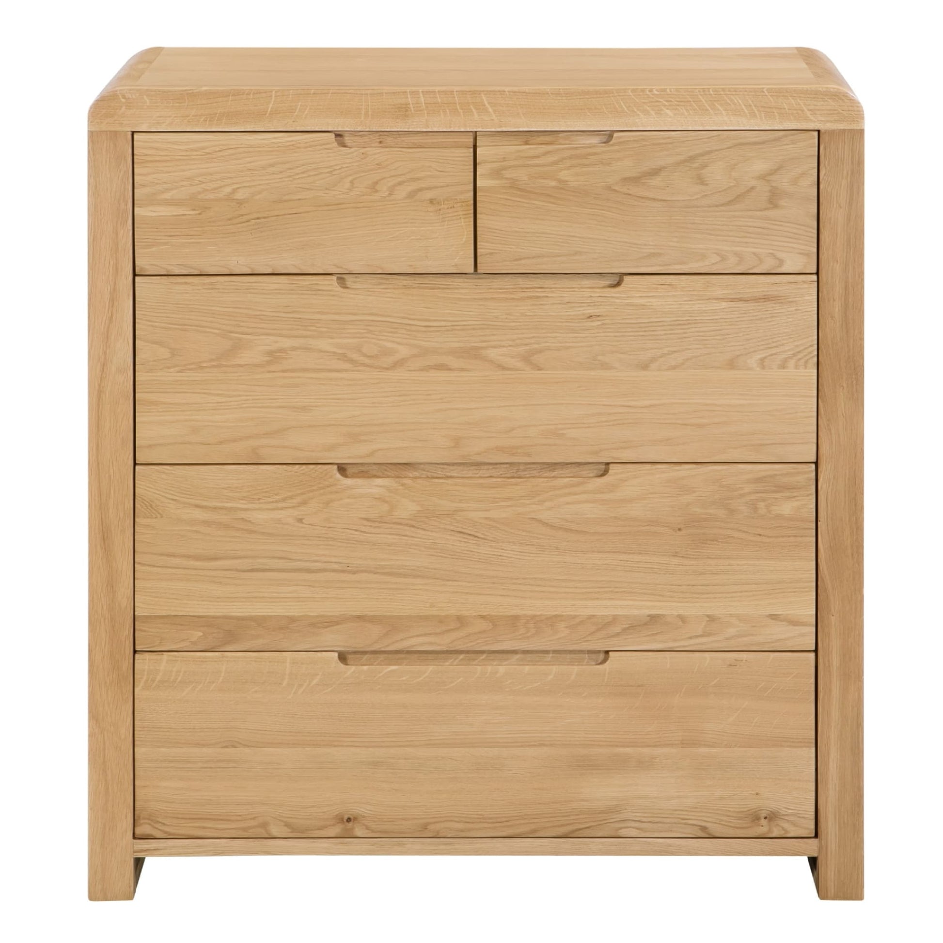 Crafted from oak and oak veneers, the Curve combines clean lines with a gentle curved edging, adding a stunning touch to any bedroom. Recessed handles enable easy opening and a modern feel. This Curve chest features three large and two small drawers, perfect for extra storage. Part of the extensive Curve bedroom range from Julian Bowen.