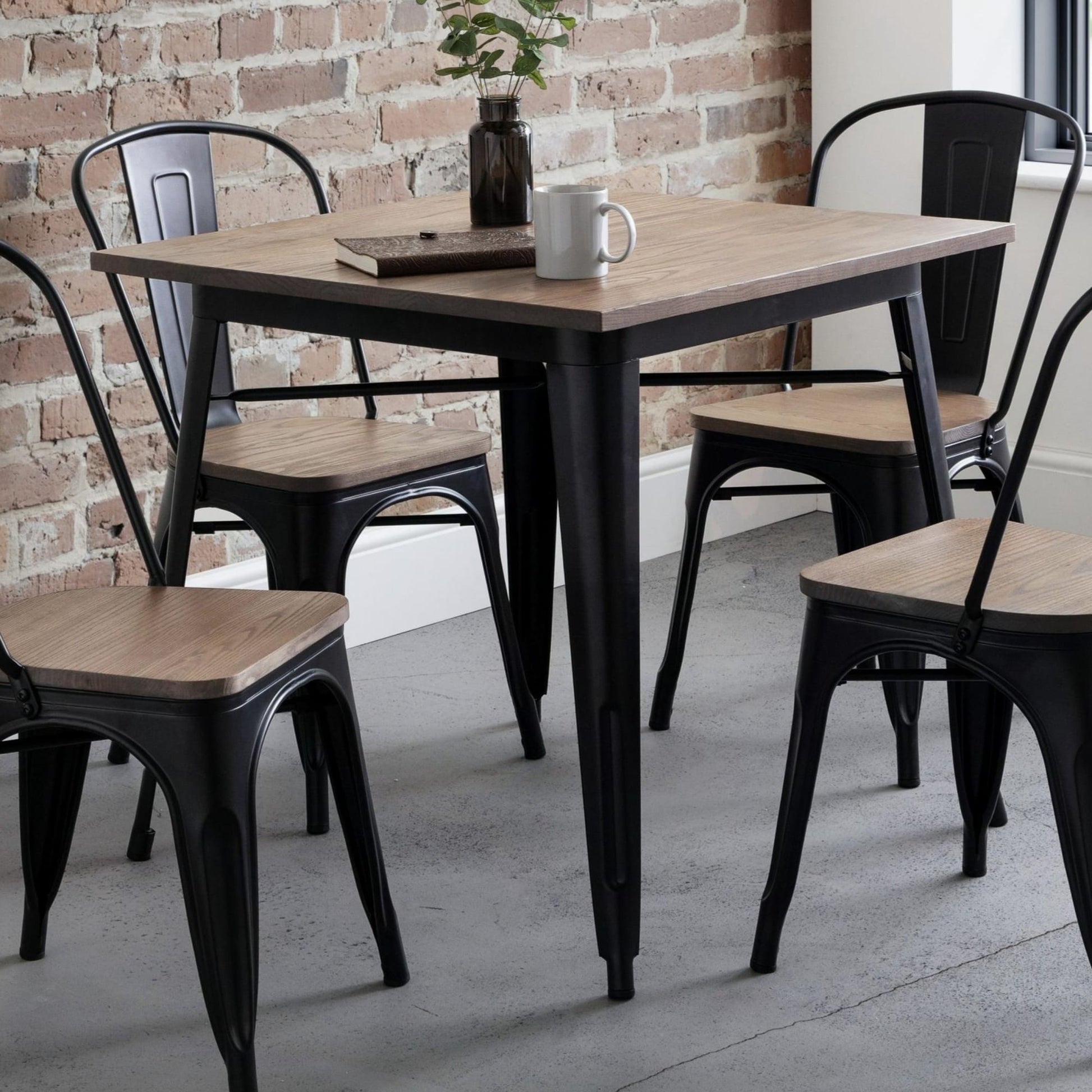 This Tolix style table is crafted from solid elm and powder coated steel. Seating up to 4 people, the Grafton Square Table offers an industrial design that is perfect for any small dining area. Finished in a mocha elm and black finish, this table is the perfect match for the Grafton Chair.
