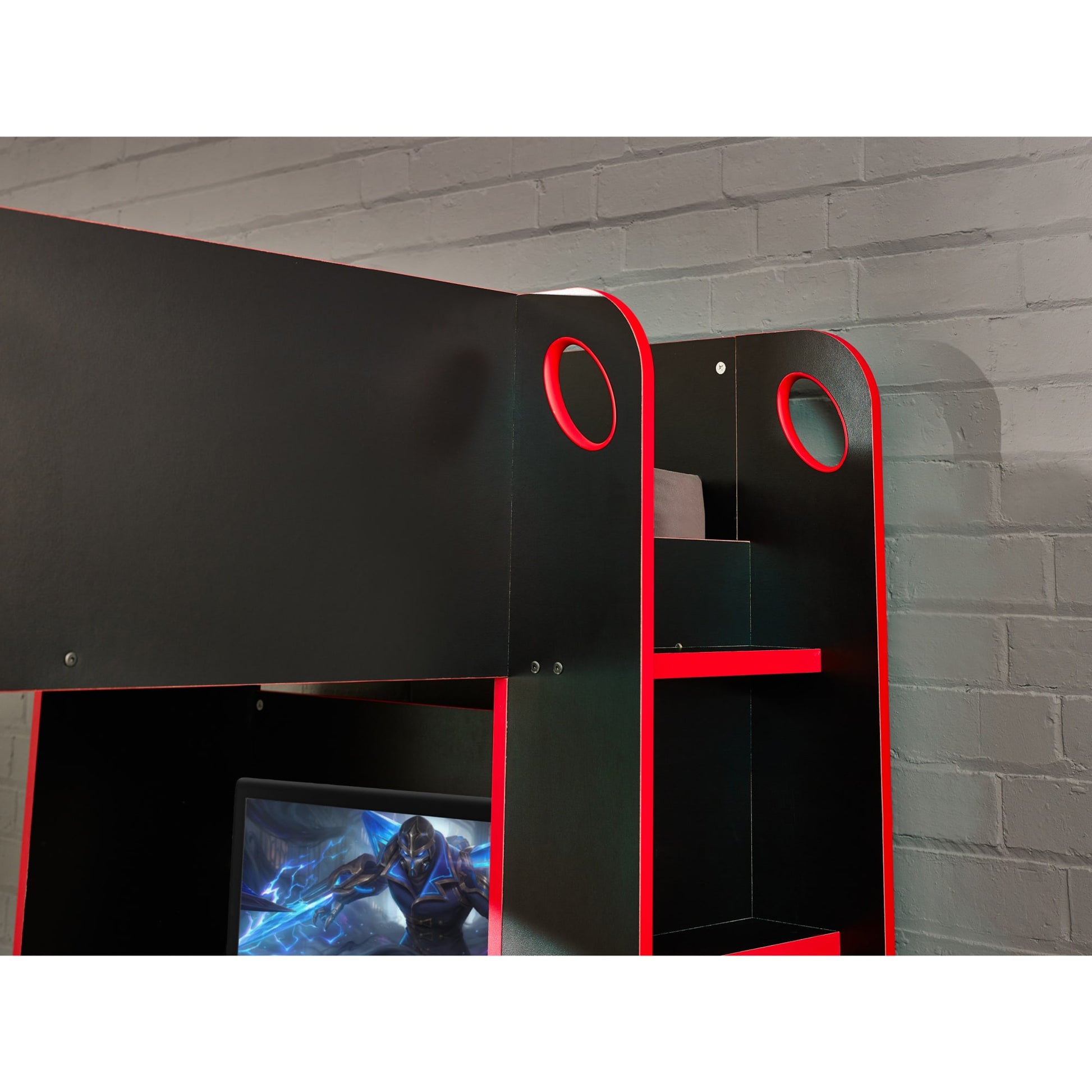 The Impact Gaming Bunk provides the perfect set up for gamers, with a large underbed space and desk for a monitor. Featuring a hanging rail and multiple storage areas, this modern gaming bed provides the ideal space to sleep, play and stream. Available in a choice of finishes.