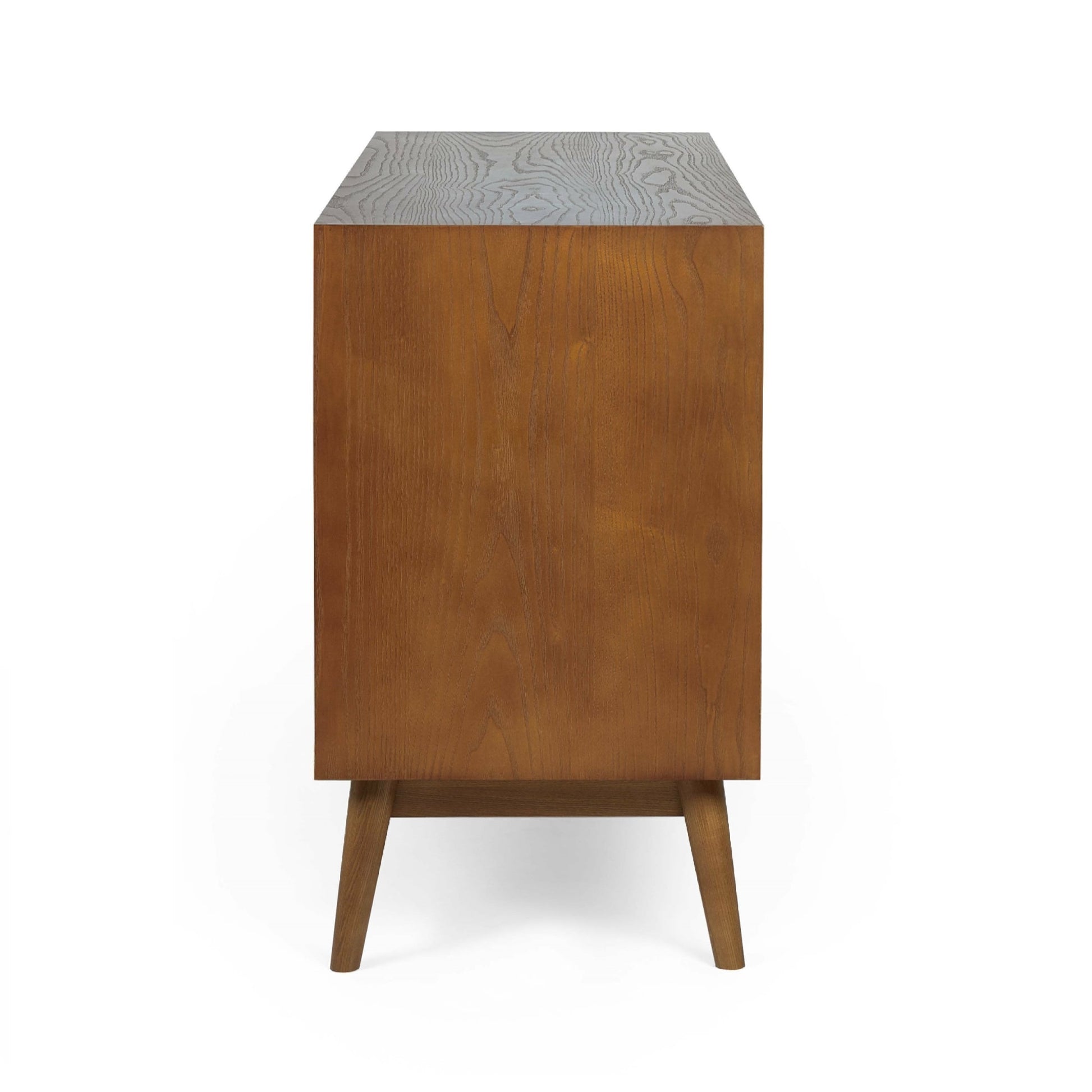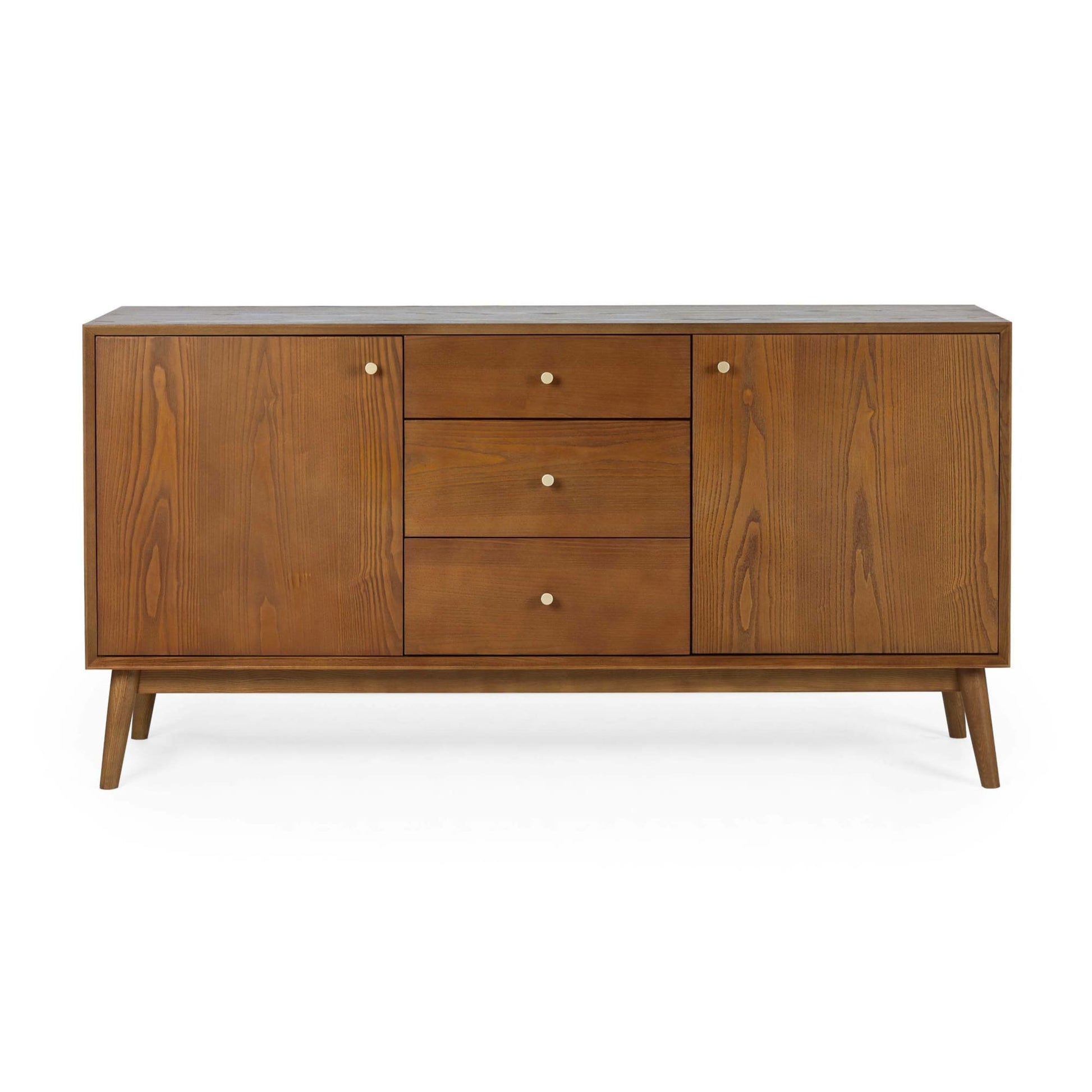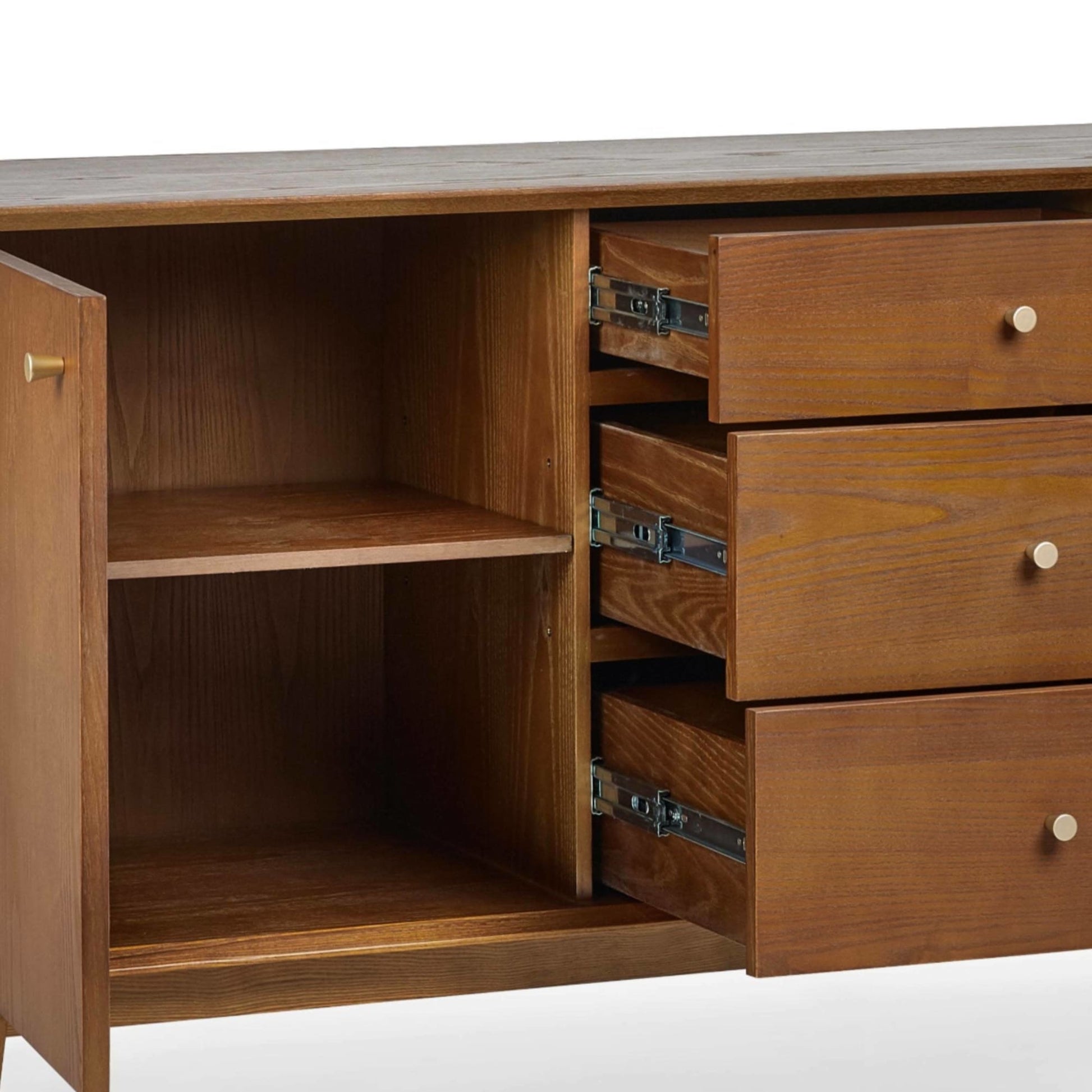 A gorgeous retro-inspired style, the Lowry Large Sideboard is constructed from an exquisite ash veneer with beautifully tapered legs. Featuring 2 wide soft-touch cupboard doors and 3 pull-out drawers. Creating the perfect ample space for storing essentials. Complemented by golden framed knobs, providing the perfect timeless staple to any occasional space.