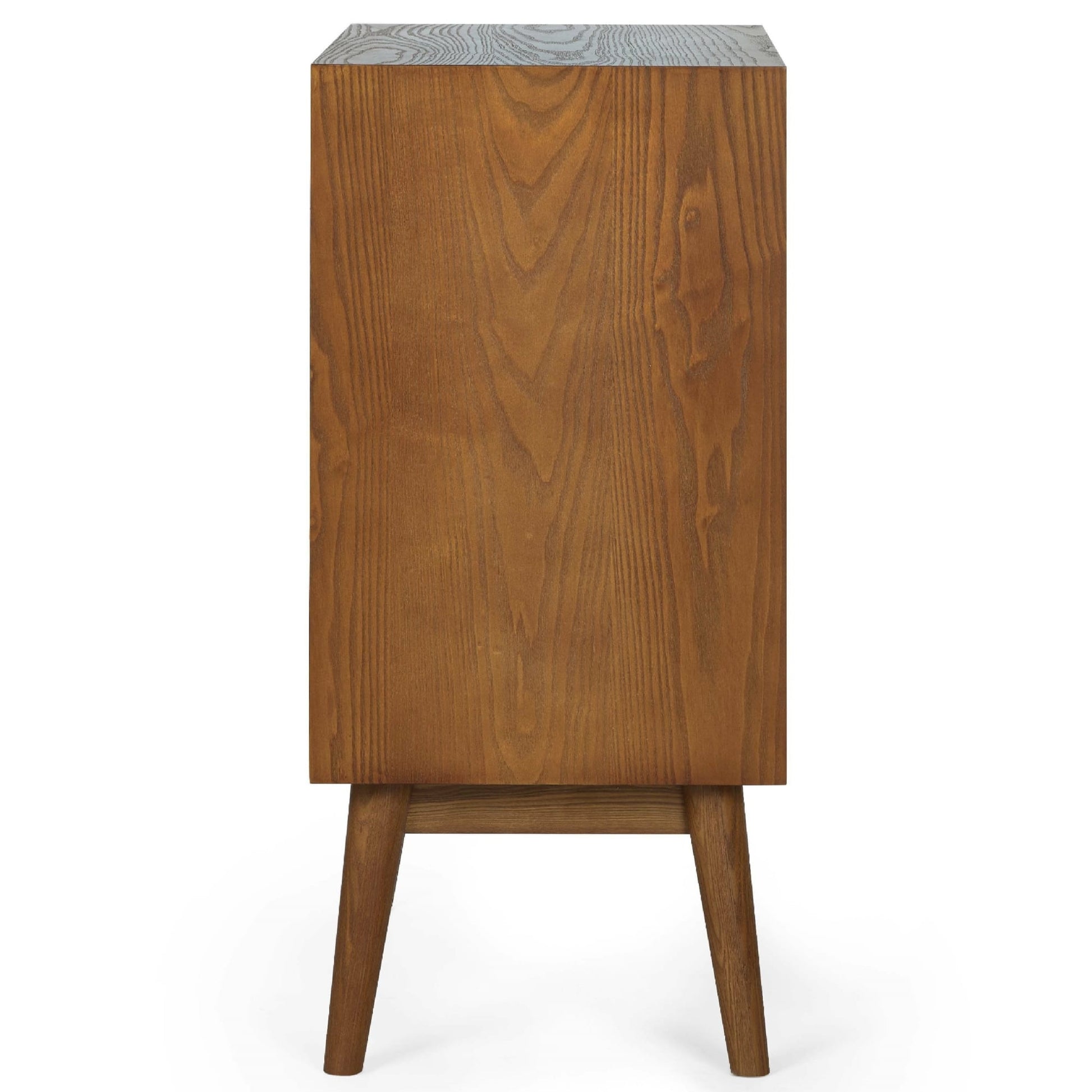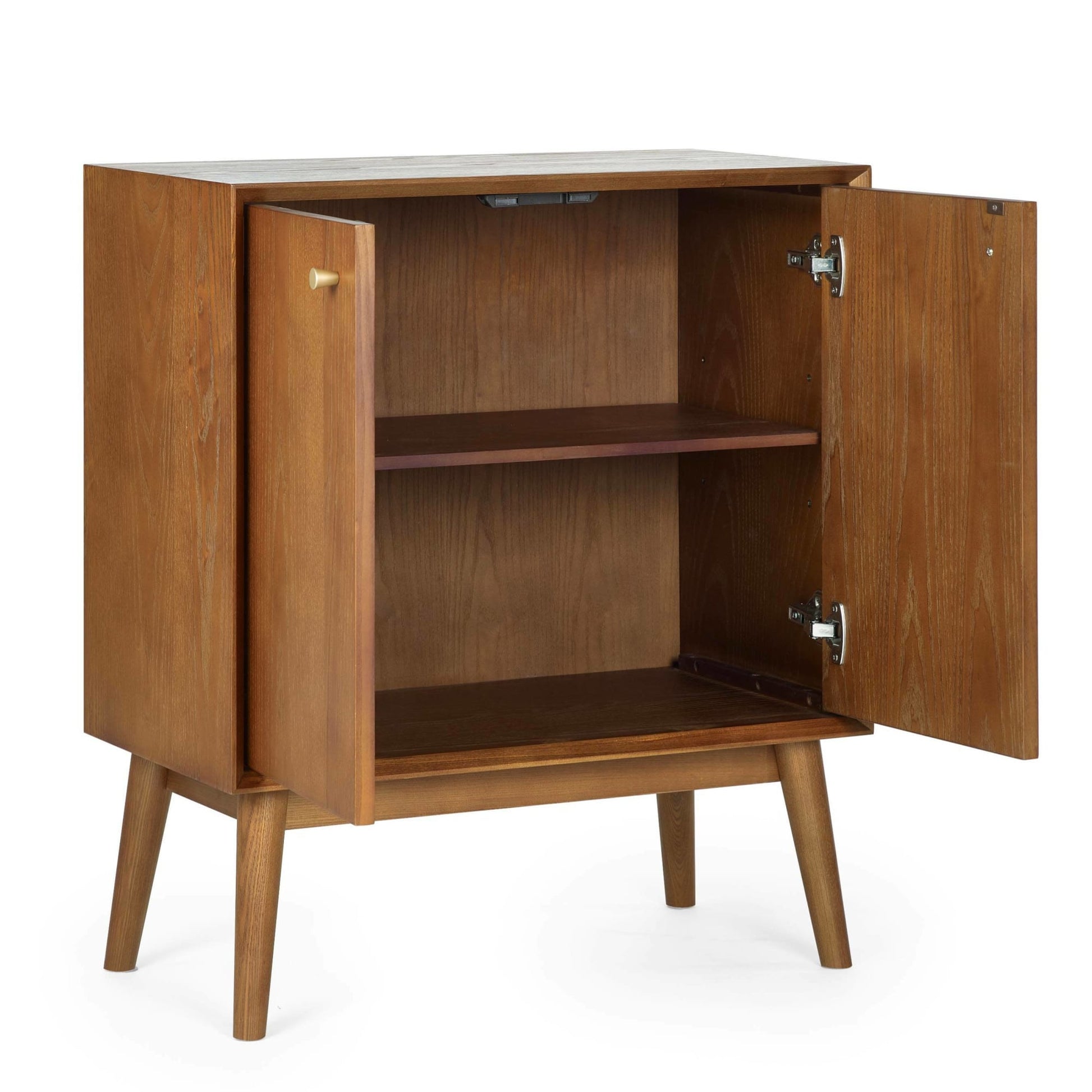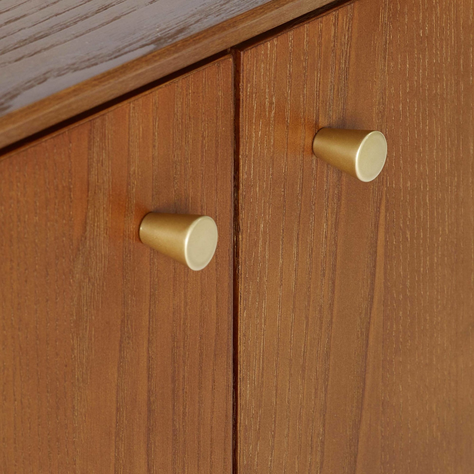 A gorgeous retro-inspired style, the Lowry Small Sideboard is constructed from an exquisite ash wood veneer with beautifully tapered legs. Featuring soft-touch cupboard doors and interior shelving, ideal for storing necessities. Complemented by gold framed knobs, providing the perfect timeless staple to any occasional space.