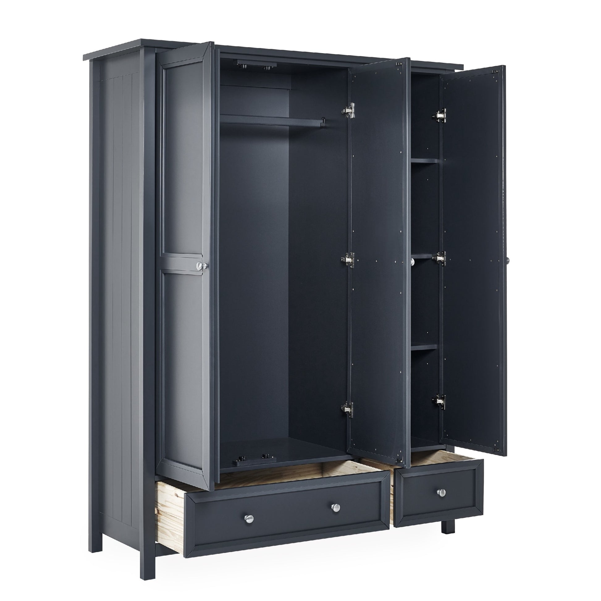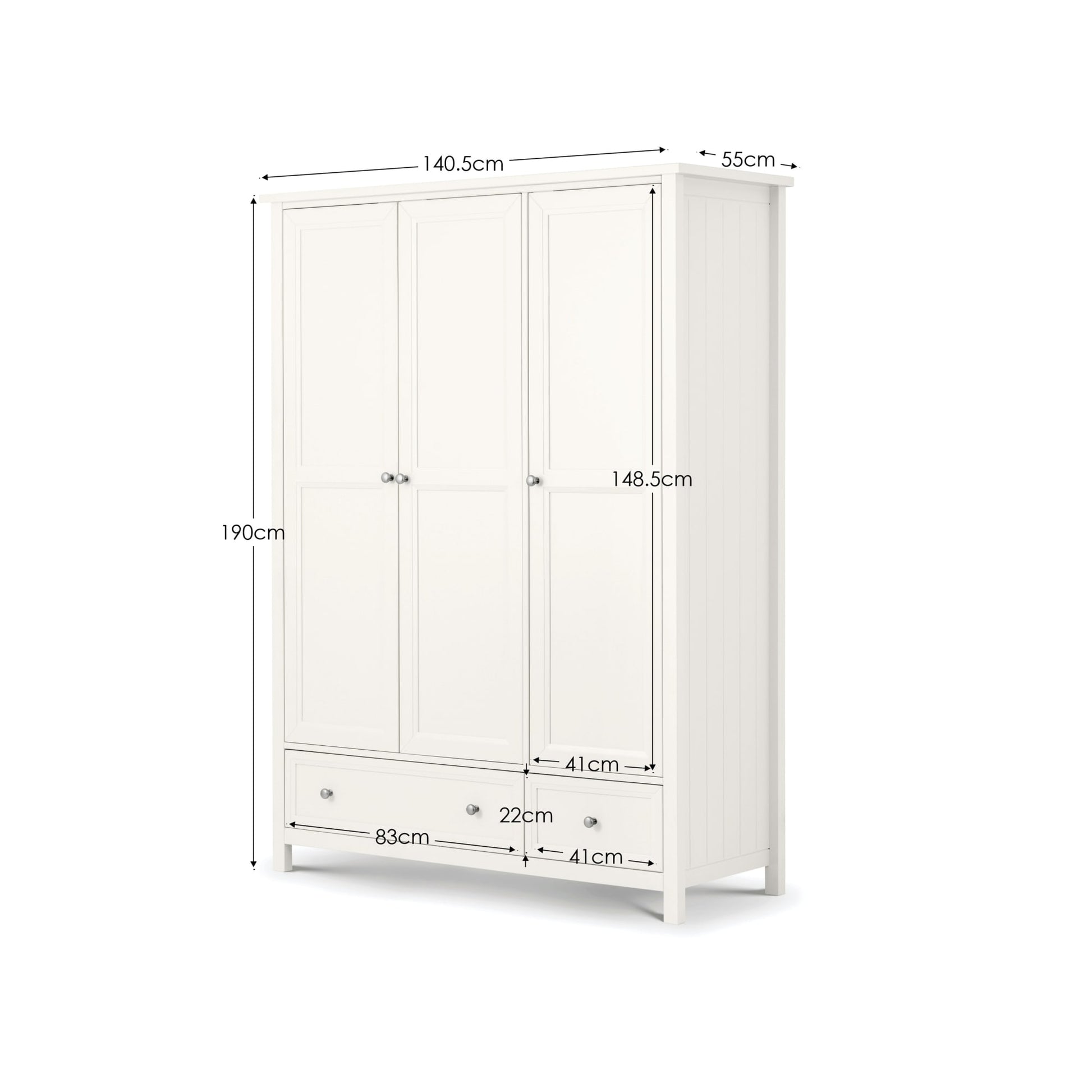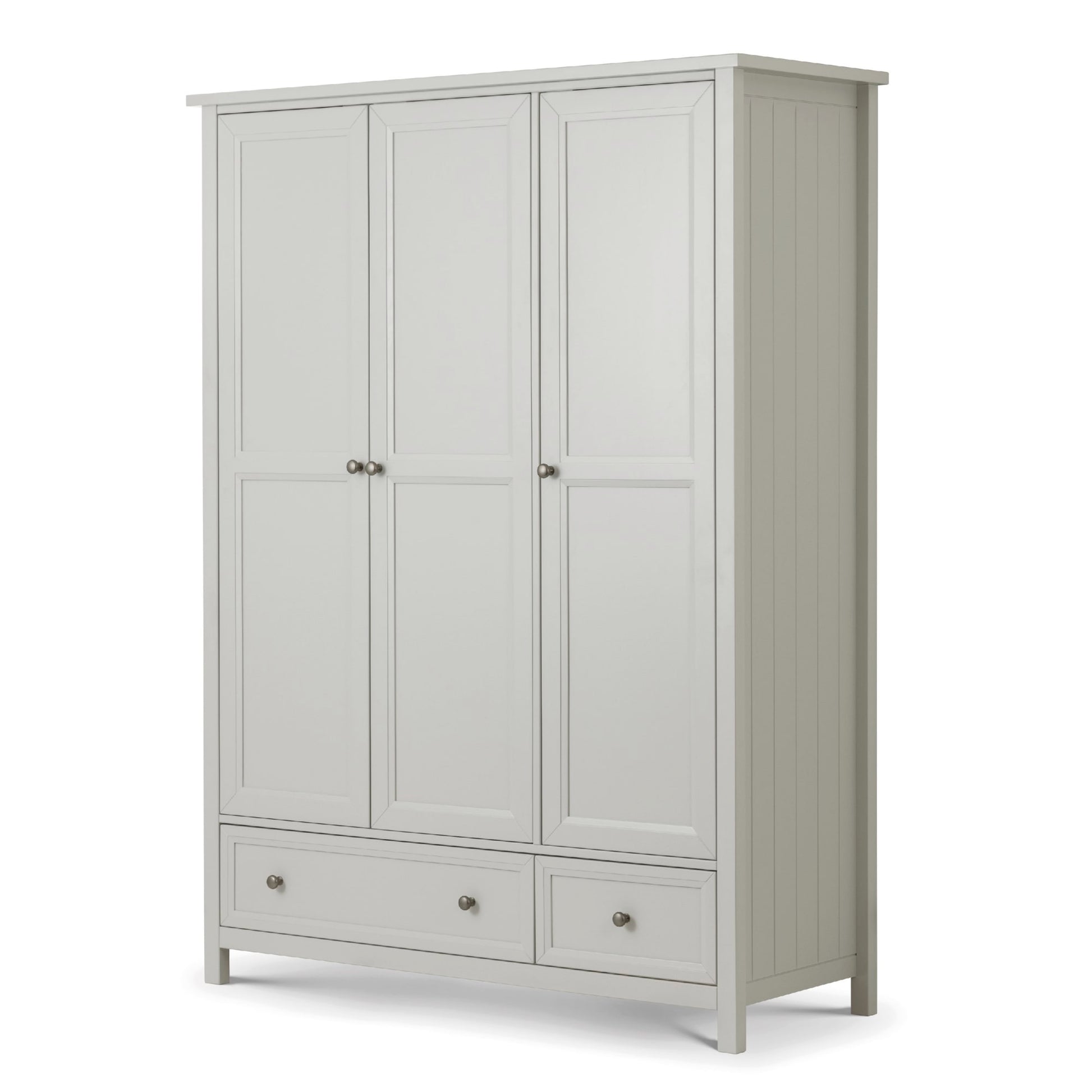 An elegant New England style wardrobe with three doors and two drawers. The combination of an exquisite lacquered finish with characteristic side panelling and detailed chamfered cabinetry makes for a soothing and refined aesthetic with timeless appeal, while delicate pewter handles add the perfect finishing touch.