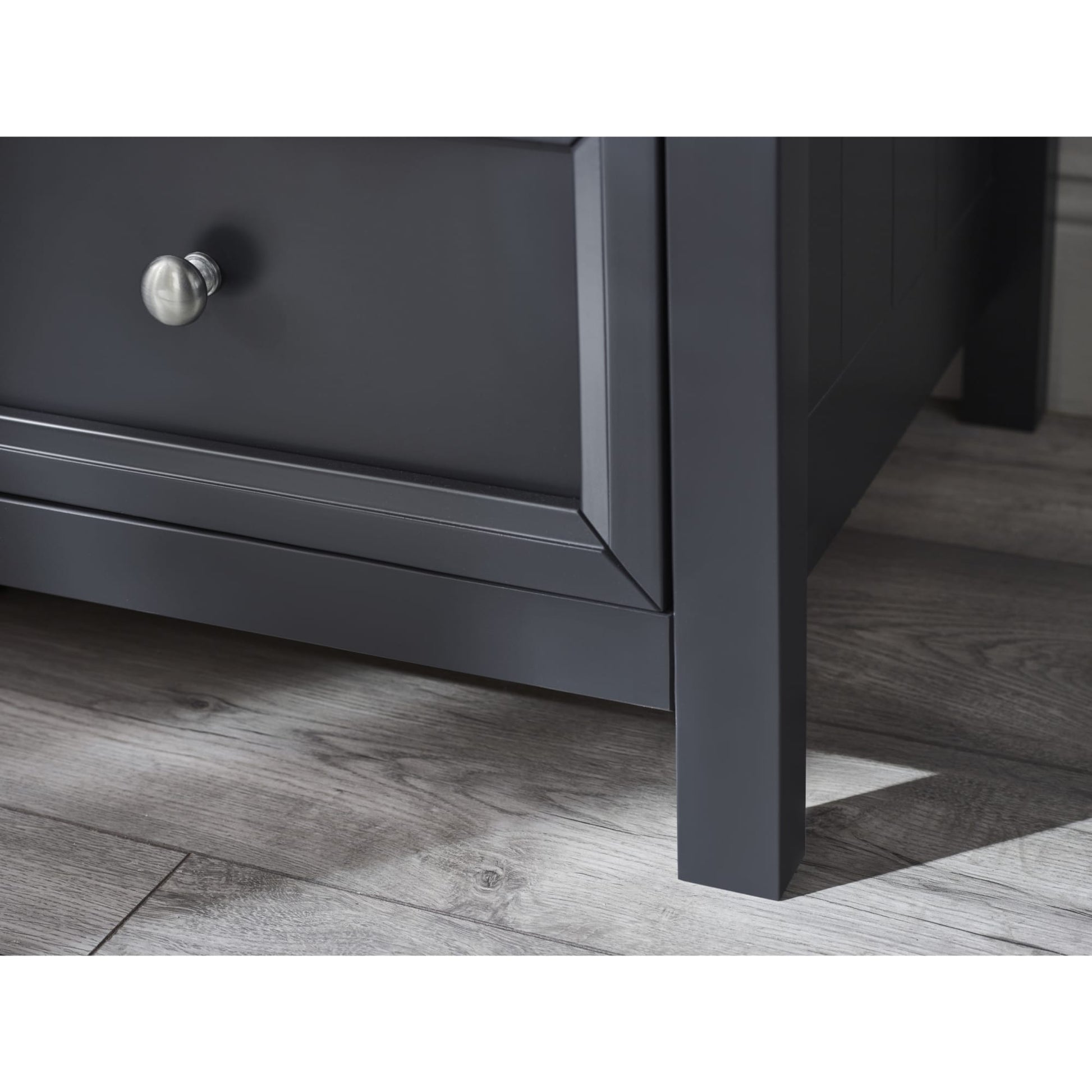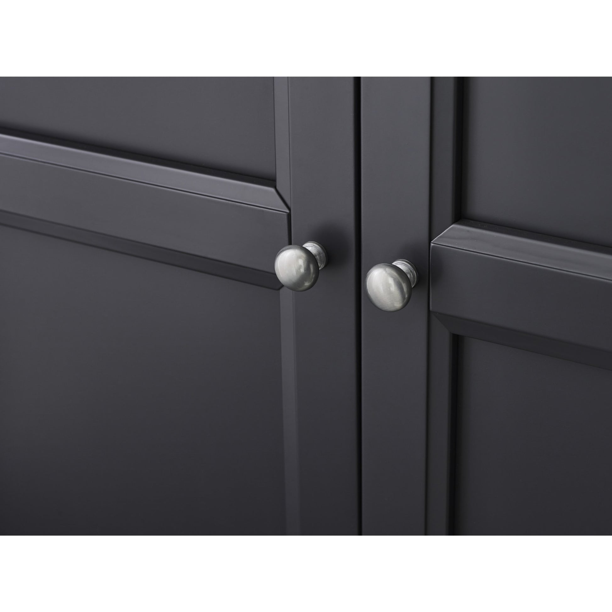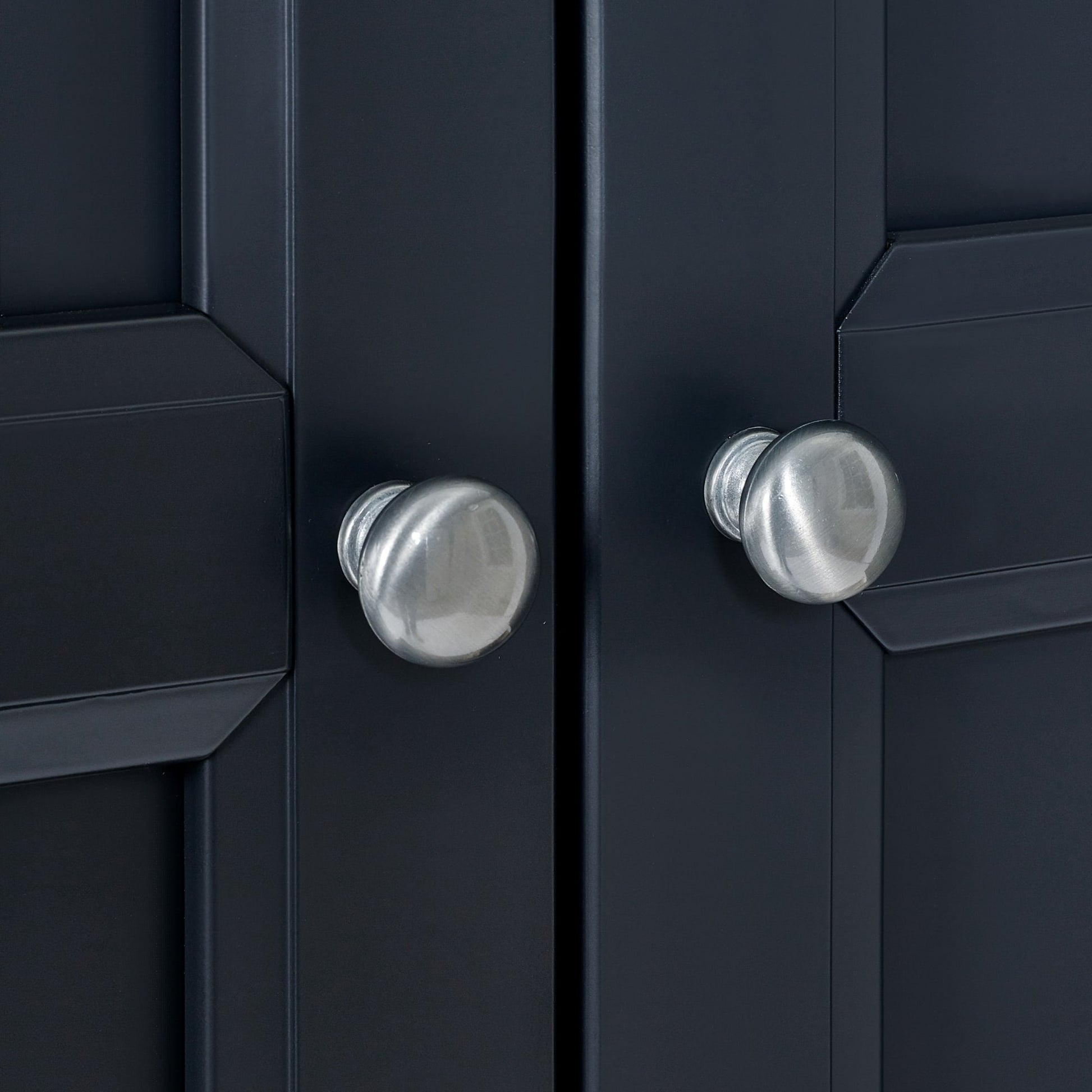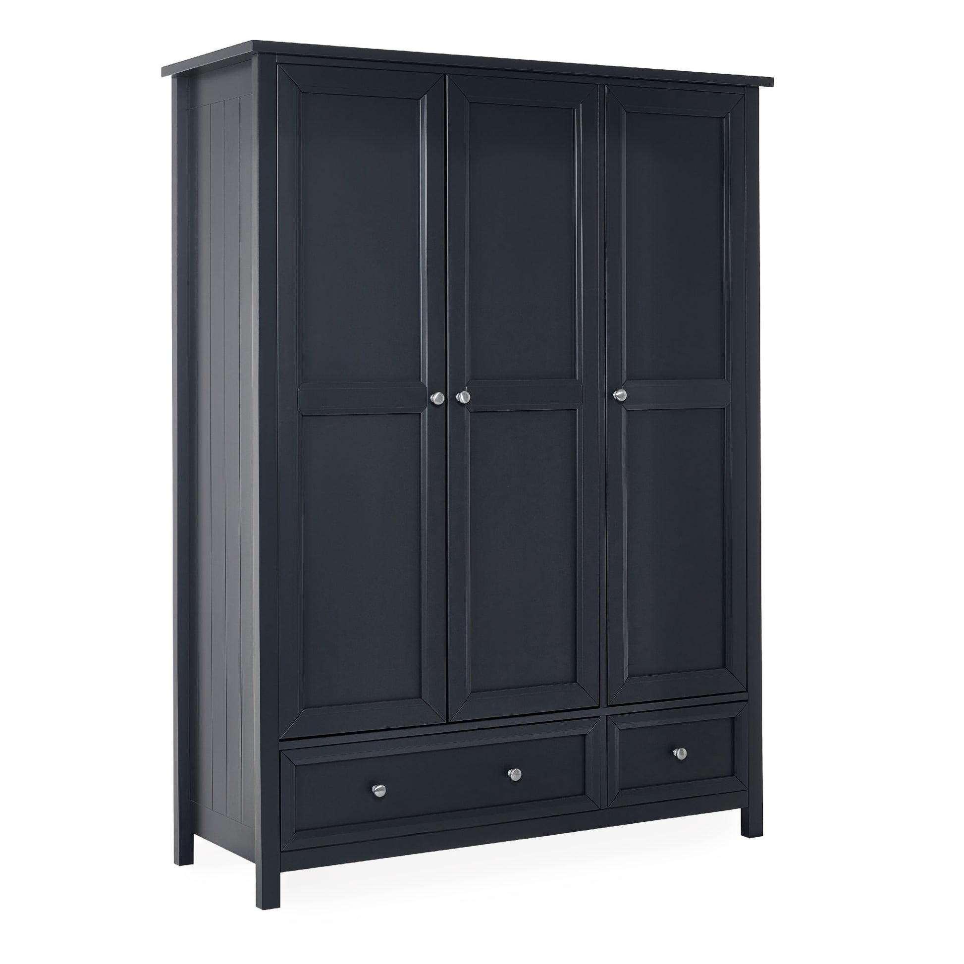 An elegant New England style wardrobe with three doors and two drawers. The combination of an exquisite lacquered finish with characteristic side panelling and detailed chamfered cabinetry makes for a soothing and refined aesthetic with timeless appeal, while delicate pewter handles add the perfect finishing touch.