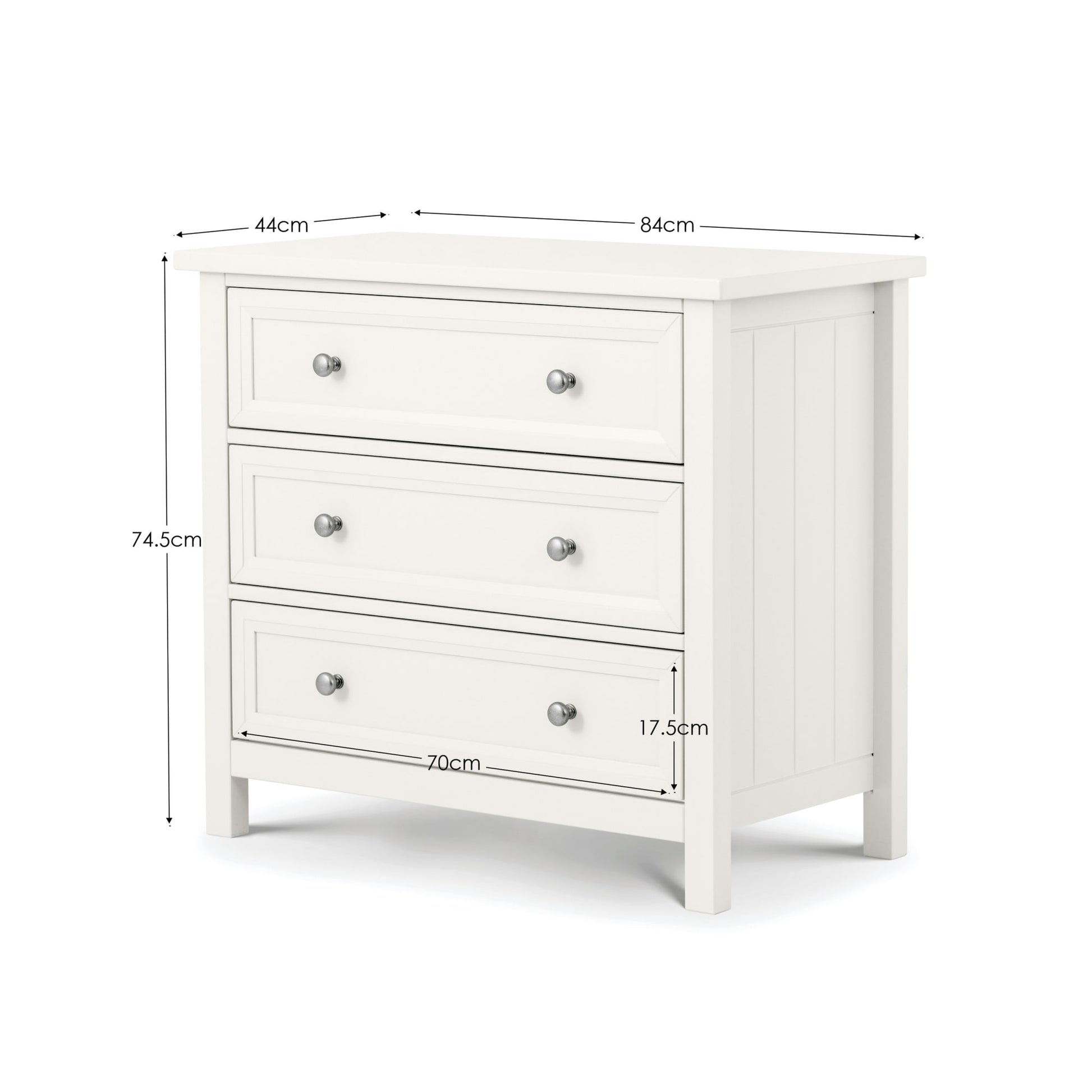 Maine is an elegant New England style range of bedroom furniture. The combination of an exquisite lacquered finish with characteristic side panelling and detailed chamfered cabinetry makes for a soothing and refined aesthetic with timeless appeal, while delicate pewter handles add the perfect finishing touch. The Maine 3 drawer wide chest offers three large storage drawers.