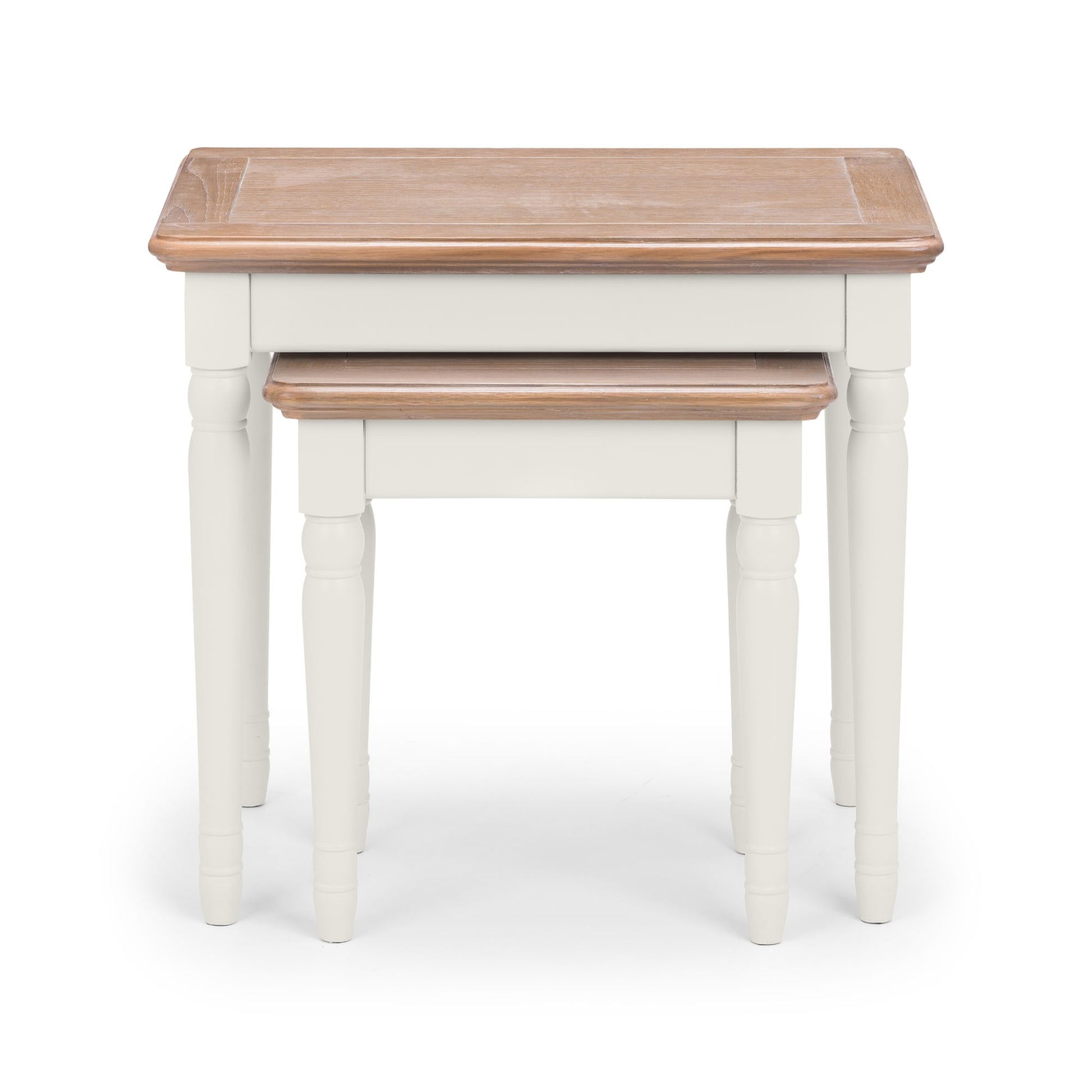 This timeless nest of tables offers an authentic antique design with a classic turned leg design perfect for contemporary spaces as well as traditional homes. Finished in a grey lacquer with a limed oak effect top, the Provence features 2 tables that perfectly fit away under one another when not in use. Part of the Provence dining and occasional collection.