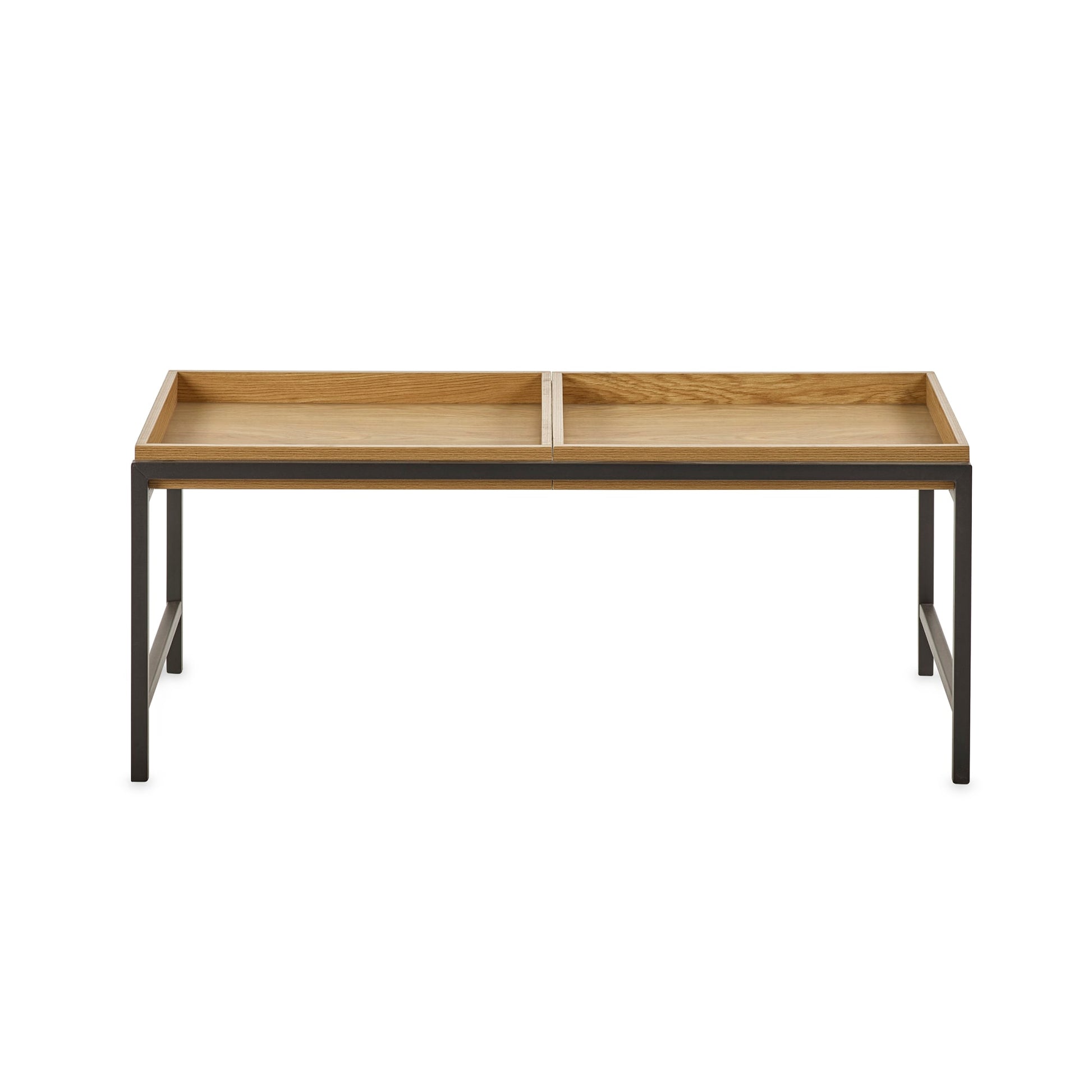 Refresh your living room with this sleek tray-style coffee table, blending contemporary design with a warm, natural finish. The wood-effect top adds texture and character, while the open black metal frame keeps the look light and airy. The tray-style top offers flexible use and added convenience. With subtle raised edges to keep items secure, it’s perfect for drinks, books, or decorative accents. Partial self-assembly required.