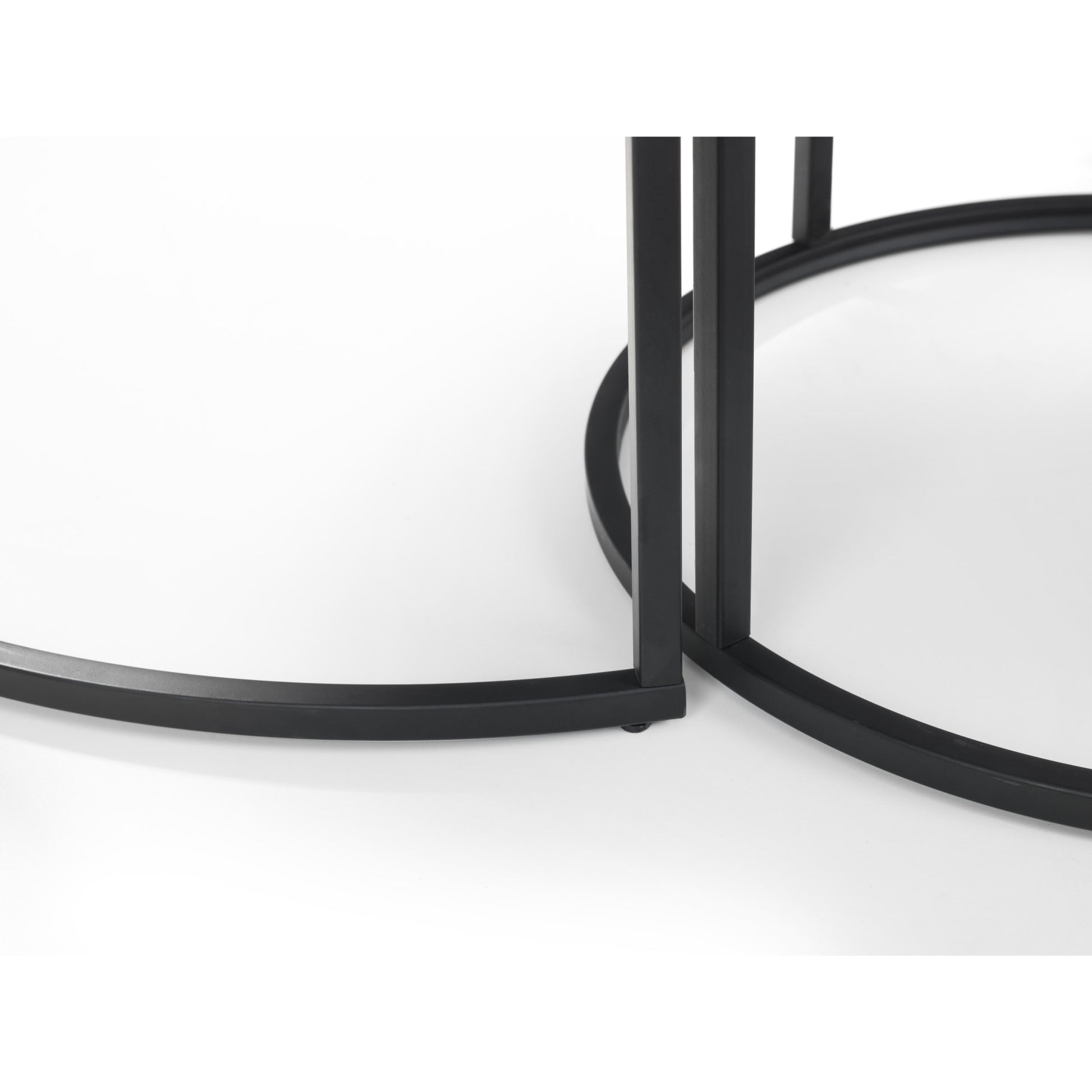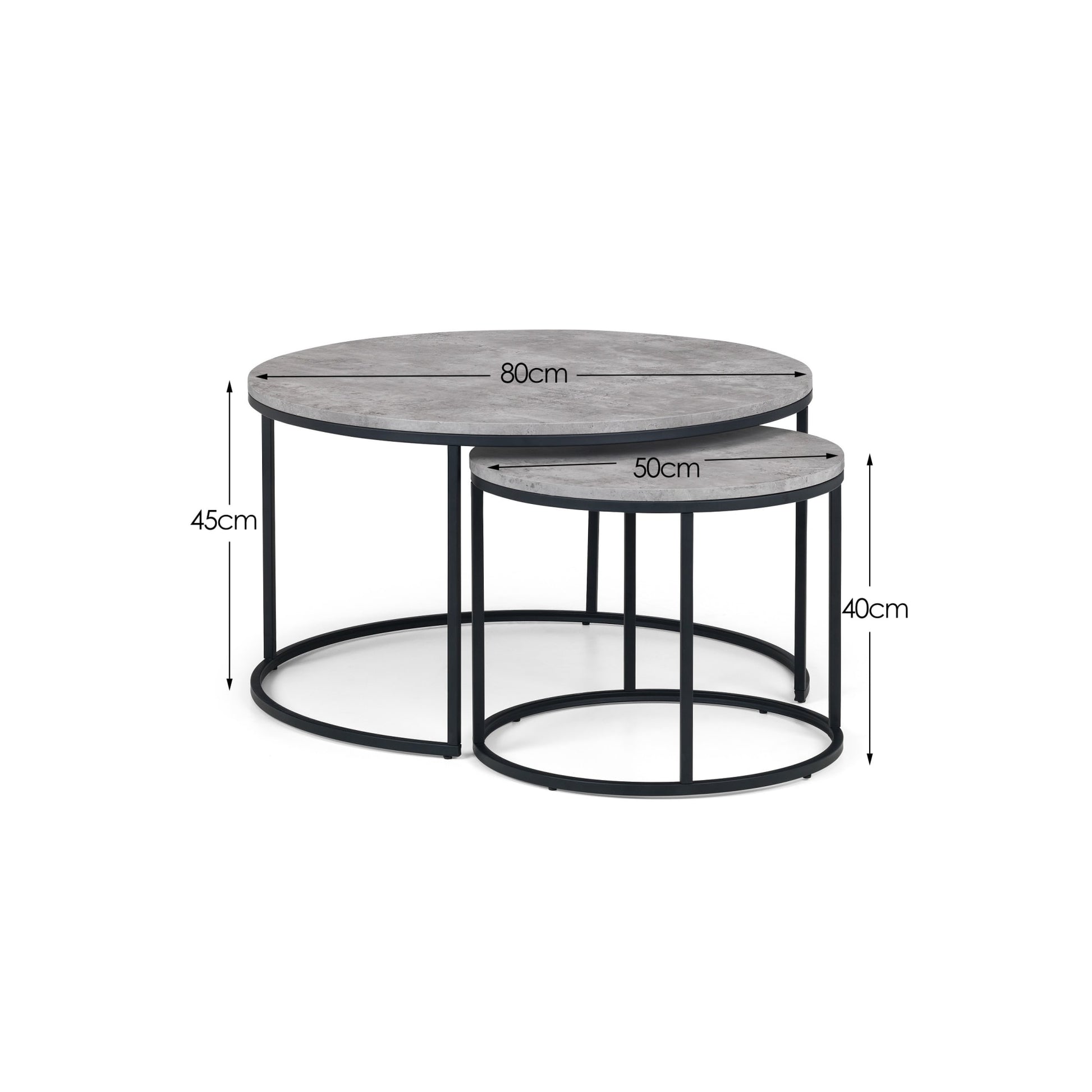 Simplistic in design with a contemporary style, the Staten Concrete Round Nesting Coffee Table will add a stunning industrial look to any dining area. Constructed from a black coated metal frame, complemented by a striking concrete effect top, to create a very stylish, modern product. Part of the Julian Bowen Staten Dining and Occasional Collection.