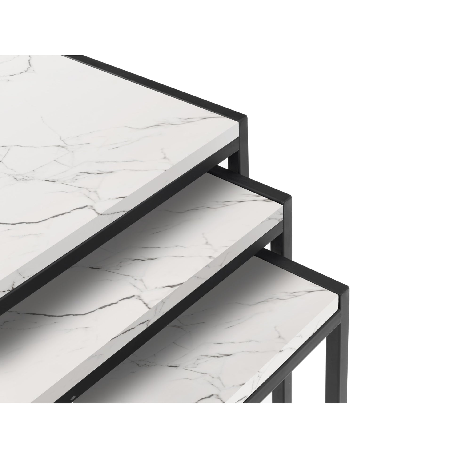 A cool, modern nest of tables designed to add a contemporary touch to any home or work place. Its simple clean lines, delineated by a subtle, black coated metal frame are complemented perfectly by a warm foil finish, to create a very stylish and sleek product.