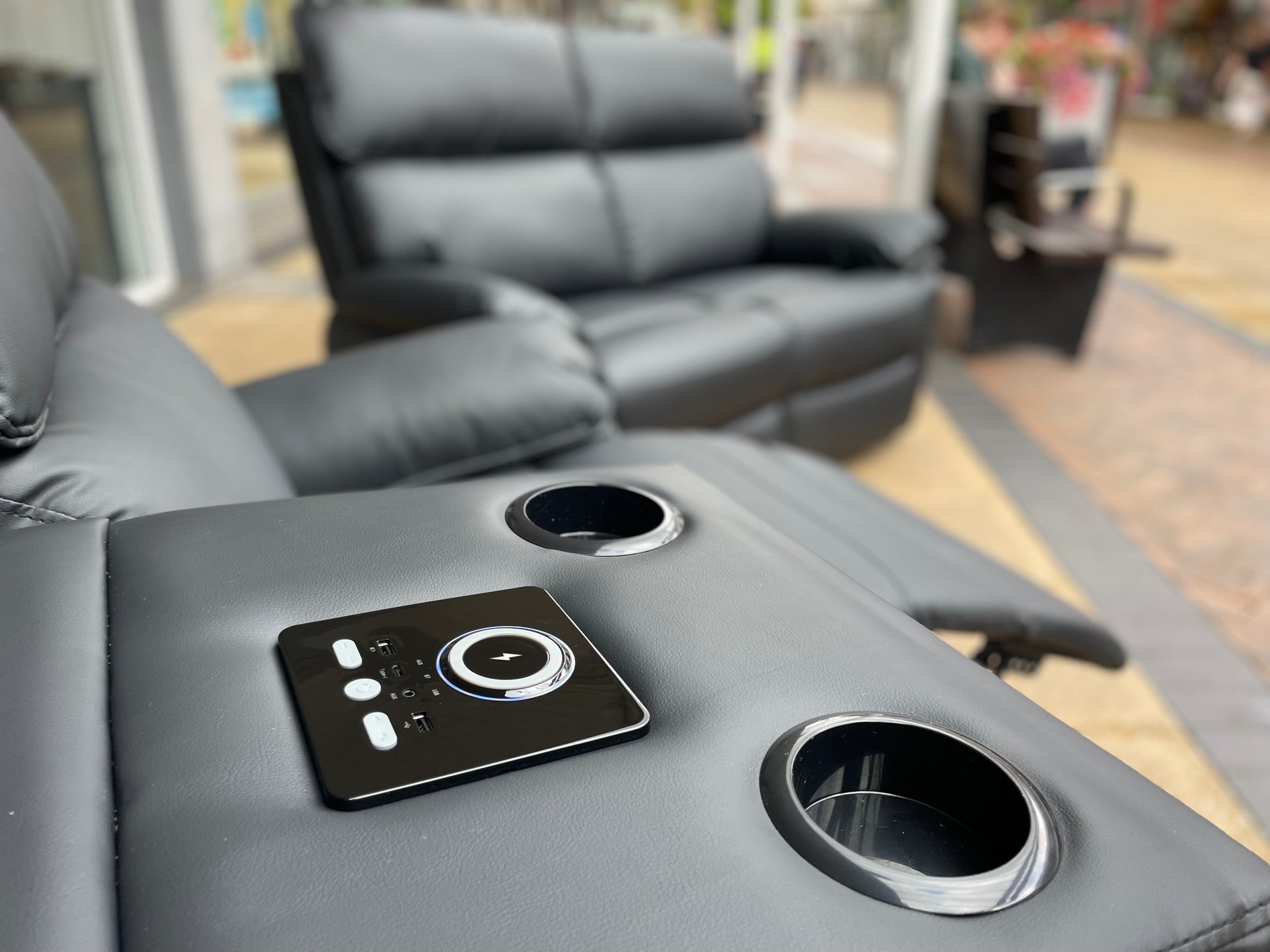 This Valencia Manual Recliner 3 seater offers a luxurious experience. The recliner allows for full comfort, with the drop down back rest on the 3 seater boasting cup holders, a wireless charger and a bluetooth speaker. Upgrade your home with this state-of-the-art sofa.